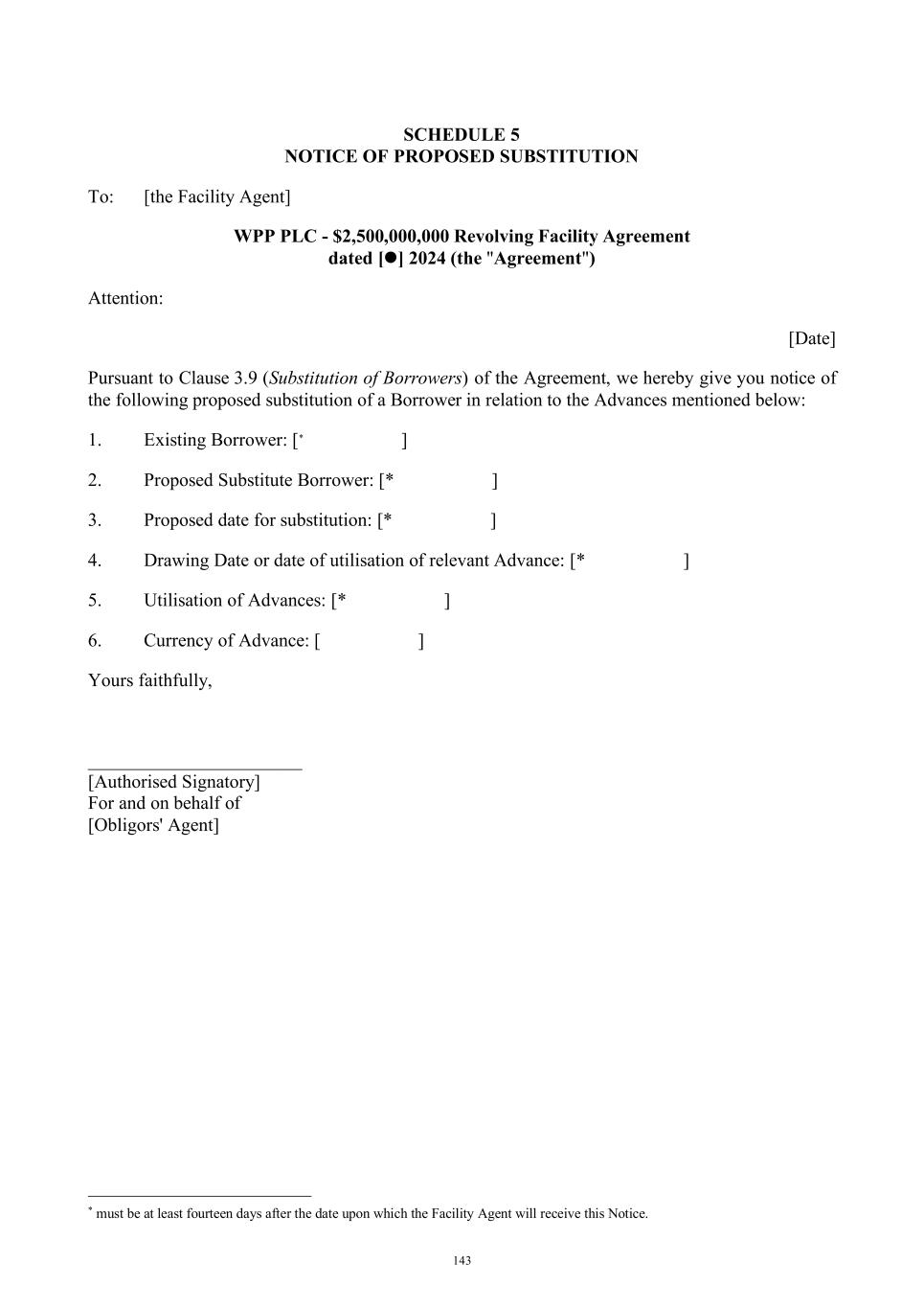 143 SCHEDULE 5 NOTICE OF PROPOSED SUBSTITUTION To: [the Facility Agent] WPP PLC - $2,500,000,000 Revolving Facility Agreement dated [] 2024 (the "Agreement") Attention: [Date] Pursuant to Clause 3.9 (Substitution of Borrowers) of the Agreement, we hereby give you notice of the following proposed substitution of a Borrower in relation to the Advances mentioned below: 1. Existing Borrower: [* ] 2. Proposed Substitute Borrower: [* ] 3. Proposed date for substitution: [* ] 4. Drawing Date or date of utilisation of relevant Advance: [* ] 5. Utilisation of Advances: [* ] 6. Currency of Advance: [ ] Yours faithfully, _______________________ [Authorised Signatory] For and on behalf of [Obligors' Agent] * must be at least fourteen days after the date upon which the Facility Agent will receive this Notice.