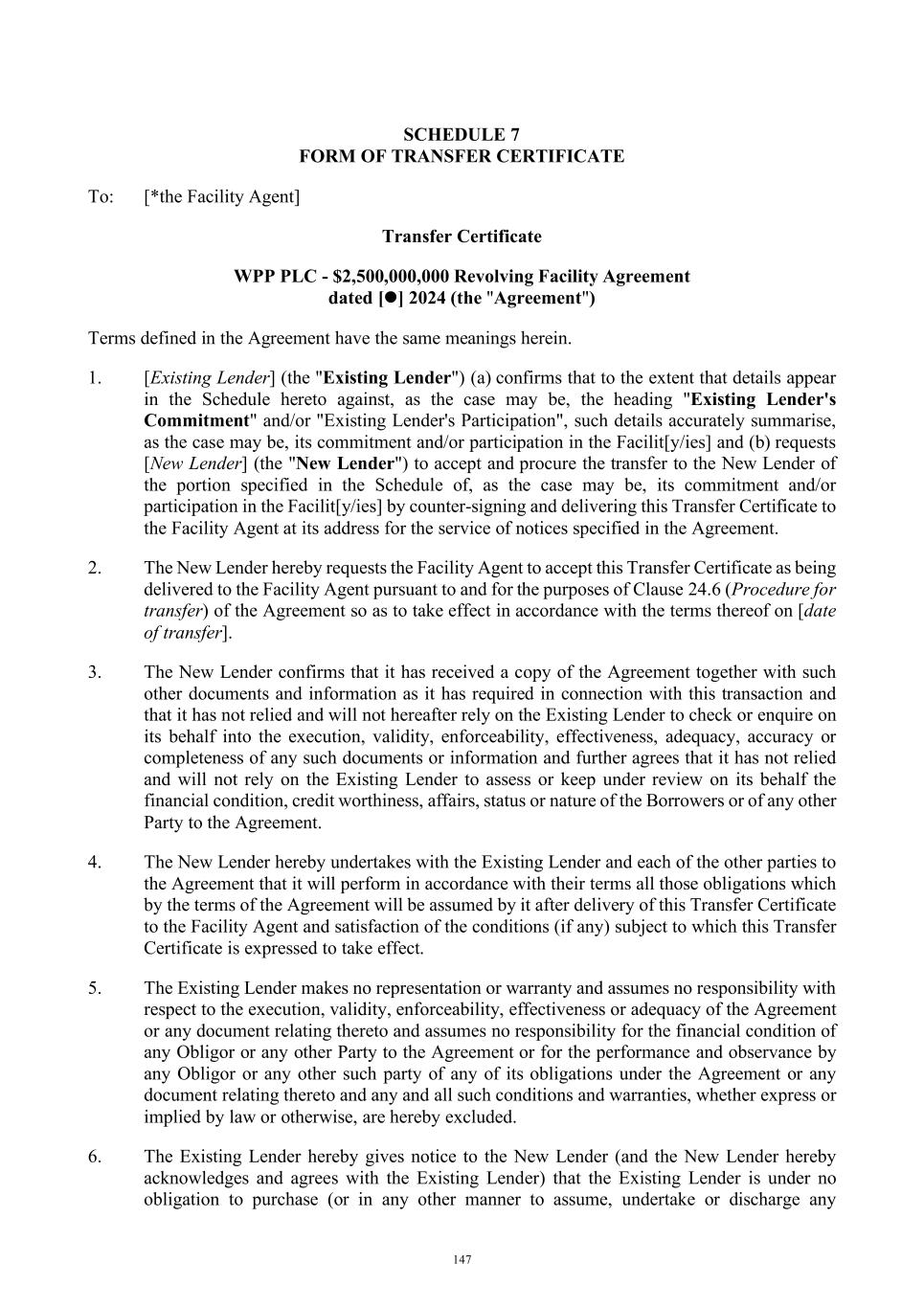 147 SCHEDULE 7 FORM OF TRANSFER CERTIFICATE To: [*the Facility Agent] Transfer Certificate WPP PLC - $2,500,000,000 Revolving Facility Agreement dated [] 2024 (the "Agreement") Terms defined in the Agreement have the same meanings herein. 1. [Existing Lender] (the "Existing Lender") (a) confirms that to the extent that details appear in the Schedule hereto against, as the case may be, the heading "Existing Lender's Commitment" and/or "Existing Lender's Participation", such details accurately summarise, as the case may be, its commitment and/or participation in the Facilit[y/ies] and (b) requests [New Lender] (the "New Lender") to accept and procure the transfer to the New Lender of the portion specified in the Schedule of, as the case may be, its commitment and/or participation in the Facilit[y/ies] by counter-signing and delivering this Transfer Certificate to the Facility Agent at its address for the service of notices specified in the Agreement. 2. The New Lender hereby requests the Facility Agent to accept this Transfer Certificate as being delivered to the Facility Agent pursuant to and for the purposes of Clause 24.6 (Procedure for transfer) of the Agreement so as to take effect in accordance with the terms thereof on [date of transfer]. 3. The New Lender confirms that it has received a copy of the Agreement together with such other documents and information as it has required in connection with this transaction and that it has not relied and will not hereafter rely on the Existing Lender to check or enquire on its behalf into the execution, validity, enforceability, effectiveness, adequacy, accuracy or completeness of any such documents or information and further agrees that it has not relied and will not rely on the Existing Lender to assess or keep under review on its behalf the financial condition, credit worthiness, affairs, status or nature of the Borrowers or of any other Party to the Agreement. 4. The New Lender hereby undertakes with the Existing Lender and each of the other parties to the Agreement that it will perform in accordance with their terms all those obligations which by the terms of the Agreement will be assumed by it after delivery of this Transfer Certificate to the Facility Agent and satisfaction of the conditions (if any) subject to which this Transfer Certificate is expressed to take effect. 5. The Existing Lender makes no representation or warranty and assumes no responsibility with respect to the execution, validity, enforceability, effectiveness or adequacy of the Agreement or any document relating thereto and assumes no responsibility for the financial condition of any Obligor or any other Party to the Agreement or for the performance and observance by any Obligor or any other such party of any of its obligations under the Agreement or any document relating thereto and any and all such conditions and warranties, whether express or implied by law or otherwise, are hereby excluded. 6. The Existing Lender hereby gives notice to the New Lender (and the New Lender hereby acknowledges and agrees with the Existing Lender) that the Existing Lender is under no obligation to purchase (or in any other manner to assume, undertake or discharge any