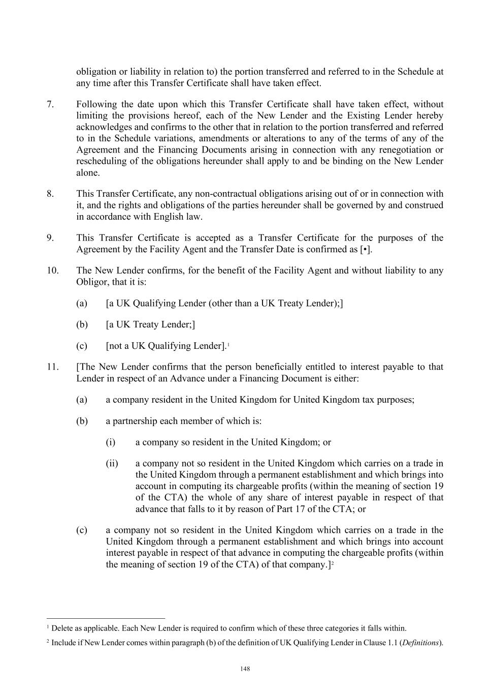 148 obligation or liability in relation to) the portion transferred and referred to in the Schedule at any time after this Transfer Certificate shall have taken effect. 7. Following the date upon which this Transfer Certificate shall have taken effect, without limiting the provisions hereof, each of the New Lender and the Existing Lender hereby acknowledges and confirms to the other that in relation to the portion transferred and referred to in the Schedule variations, amendments or alterations to any of the terms of any of the Agreement and the Financing Documents arising in connection with any renegotiation or rescheduling of the obligations hereunder shall apply to and be binding on the New Lender alone. 8. This Transfer Certificate, any non-contractual obligations arising out of or in connection with it, and the rights and obligations of the parties hereunder shall be governed by and construed in accordance with English law. 9. This Transfer Certificate is accepted as a Transfer Certificate for the purposes of the Agreement by the Facility Agent and the Transfer Date is confirmed as [•]. 10. The New Lender confirms, for the benefit of the Facility Agent and without liability to any Obligor, that it is: (a) [a UK Qualifying Lender (other than a UK Treaty Lender);] (b) [a UK Treaty Lender;] (c) [not a UK Qualifying Lender].1 11. [The New Lender confirms that the person beneficially entitled to interest payable to that Lender in respect of an Advance under a Financing Document is either: (a) a company resident in the United Kingdom for United Kingdom tax purposes; (b) a partnership each member of which is: (i) a company so resident in the United Kingdom; or (ii) a company not so resident in the United Kingdom which carries on a trade in the United Kingdom through a permanent establishment and which brings into account in computing its chargeable profits (within the meaning of section 19 of the CTA) the whole of any share of interest payable in respect of that advance that falls to it by reason of Part 17 of the CTA; or (c) a company not so resident in the United Kingdom which carries on a trade in the United Kingdom through a permanent establishment and which brings into account interest payable in respect of that advance in computing the chargeable profits (within the meaning of section 19 of the CTA) of that company.]2 1 Delete as applicable. Each New Lender is required to confirm which of these three categories it falls within. 2 Include if New Lender comes within paragraph (b) of the definition of UK Qualifying Lender in Clause 1.1 (Definitions).