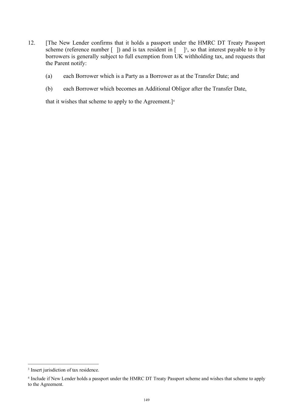 149 12. [The New Lender confirms that it holds a passport under the HMRC DT Treaty Passport scheme (reference number [ ]) and is tax resident in [ ]3, so that interest payable to it by borrowers is generally subject to full exemption from UK withholding tax, and requests that the Parent notify: (a) each Borrower which is a Party as a Borrower as at the Transfer Date; and (b) each Borrower which becomes an Additional Obligor after the Transfer Date, that it wishes that scheme to apply to the Agreement.]4 3 Insert jurisdiction of tax residence. 4 Include if New Lender holds a passport under the HMRC DT Treaty Passport scheme and wishes that scheme to apply to the Agreement.