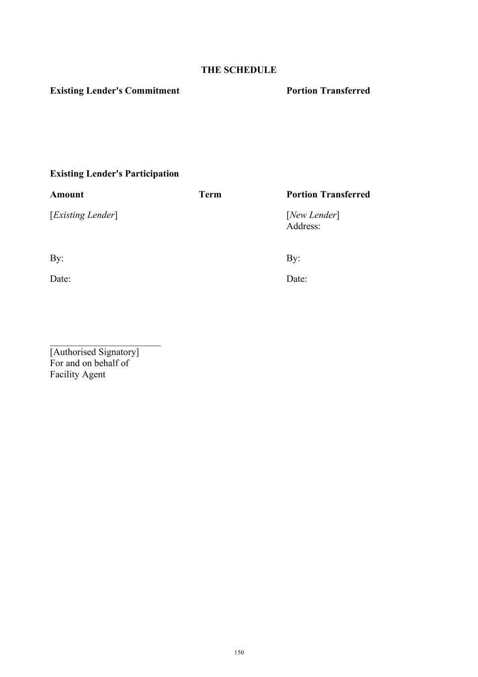 150 THE SCHEDULE Existing Lender's Commitment Portion Transferred Existing Lender's Participation Amount Term Portion Transferred [Existing Lender] [New Lender] Address: By: By: Date: Date: _______________________ [Authorised Signatory] For and on behalf of Facility Agent