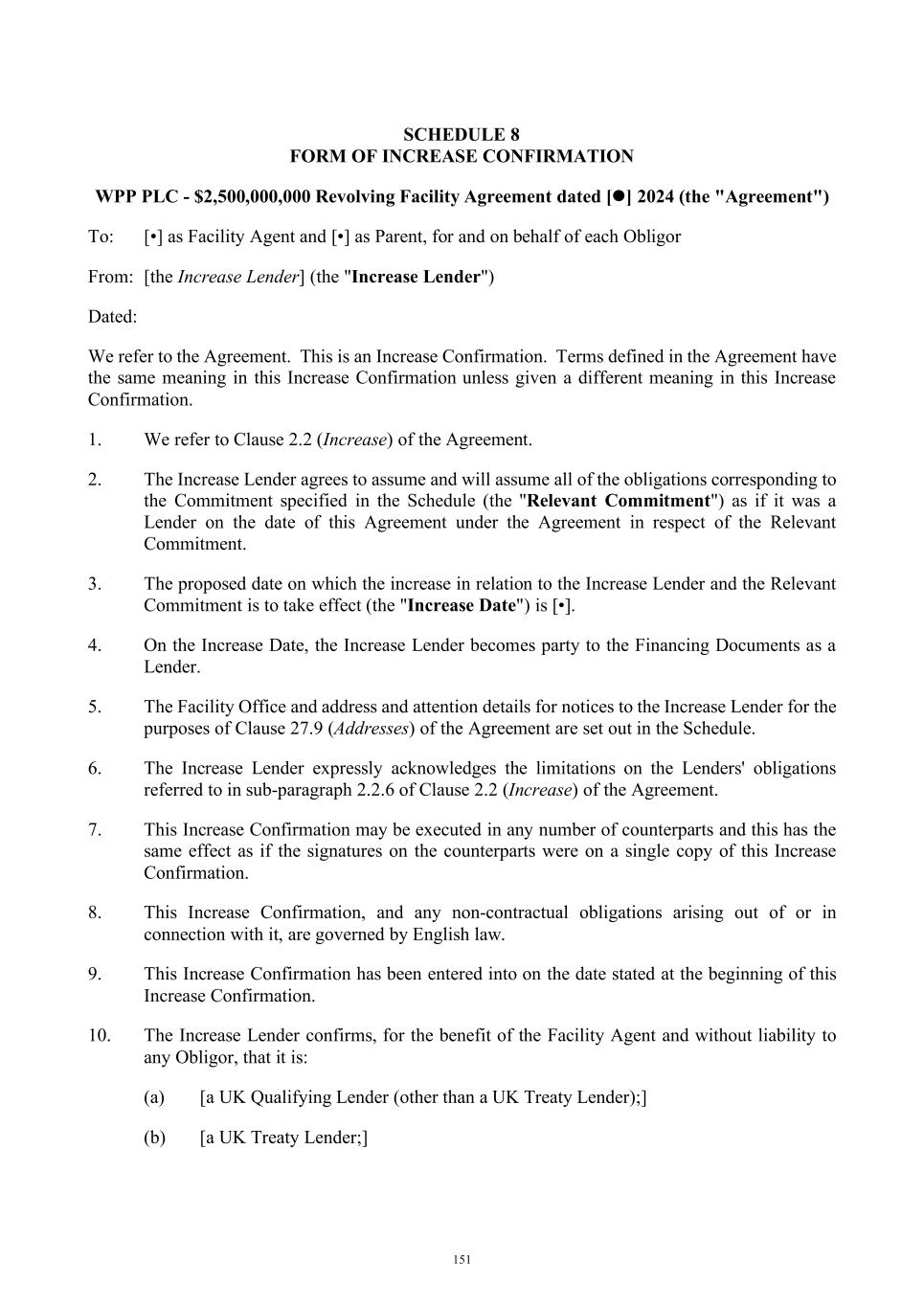 151 SCHEDULE 8 FORM OF INCREASE CONFIRMATION WPP PLC - $2,500,000,000 Revolving Facility Agreement dated [] 2024 (the "Agreement") To: [•] as Facility Agent and [•] as Parent, for and on behalf of each Obligor From: [the Increase Lender] (the "Increase Lender") Dated: We refer to the Agreement. This is an Increase Confirmation. Terms defined in the Agreement have the same meaning in this Increase Confirmation unless given a different meaning in this Increase Confirmation. 1. We refer to Clause 2.2 (Increase) of the Agreement. 2. The Increase Lender agrees to assume and will assume all of the obligations corresponding to the Commitment specified in the Schedule (the "Relevant Commitment") as if it was a Lender on the date of this Agreement under the Agreement in respect of the Relevant Commitment. 3. The proposed date on which the increase in relation to the Increase Lender and the Relevant Commitment is to take effect (the "Increase Date") is [•]. 4. On the Increase Date, the Increase Lender becomes party to the Financing Documents as a Lender. 5. The Facility Office and address and attention details for notices to the Increase Lender for the purposes of Clause 27.9 (Addresses) of the Agreement are set out in the Schedule. 6. The Increase Lender expressly acknowledges the limitations on the Lenders' obligations referred to in sub-paragraph 2.2.6 of Clause 2.2 (Increase) of the Agreement. 7. This Increase Confirmation may be executed in any number of counterparts and this has the same effect as if the signatures on the counterparts were on a single copy of this Increase Confirmation. 8. This Increase Confirmation, and any non-contractual obligations arising out of or in connection with it, are governed by English law. 9. This Increase Confirmation has been entered into on the date stated at the beginning of this Increase Confirmation. 10. The Increase Lender confirms, for the benefit of the Facility Agent and without liability to any Obligor, that it is: (a) [a UK Qualifying Lender (other than a UK Treaty Lender);] (b) [a UK Treaty Lender;]