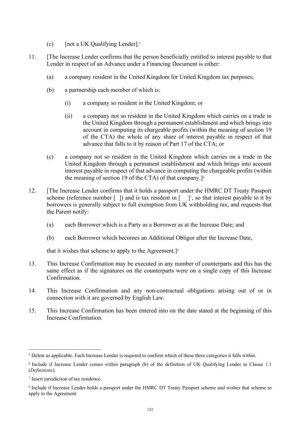 152 (c) [not a UK Qualifying Lender].5 11. [The Increase Lender confirms that the person beneficially entitled to interest payable to that Lender in respect of an Advance under a Financing Document is either: (a) a company resident in the United Kingdom for United Kingdom tax purposes; (b) a partnership each member of which is: (i) a company so resident in the United Kingdom; or (ii) a company not so resident in the United Kingdom which carries on a trade in the United Kingdom through a permanent establishment and which brings into account in computing its chargeable profits (within the meaning of section 19 of the CTA) the whole of any share of interest payable in respect of that advance that falls to it by reason of Part 17 of the CTA; or (c) a company not so resident in the United Kingdom which carries on a trade in the United Kingdom through a permanent establishment and which brings into account interest payable in respect of that advance in computing the chargeable profits (within the meaning of section 19 of the CTA) of that company.]6 12. [The Increase Lender confirms that it holds a passport under the HMRC DT Treaty Passport scheme (reference number [ ]) and is tax resident in [ ]7, so that interest payable to it by borrowers is generally subject to full exemption from UK withholding tax, and requests that the Parent notify: (a) each Borrower which is a Party as a Borrower as at the Increase Date; and (b) each Borrower which becomes an Additional Obligor after the Increase Date, that it wishes that scheme to apply to the Agreement.]8 13. This Increase Confirmation may be executed in any number of counterparts and this has the same effect as if the signatures on the counterparts were on a single copy of this Increase Confirmation. 14. This Increase Confirmation and any non-contractual obligations arising out of or in connection with it are governed by English Law. 15. This Increase Confirmation has been entered into on the date stated at the beginning of this Increase Confirmation. 5 Delete as applicable. Each Increase Lender is required to confirm which of these three categories it falls within. 6 Include if Increase Lender comes within paragraph (b) of the definition of UK Qualifying Lender in Clause 1.1 (Definitions). 7 Insert jurisdiction of tax residence. 8 Include if Increase Lender holds a passport under the HMRC DT Treaty Passport scheme and wishes that scheme to apply to the Agreement.