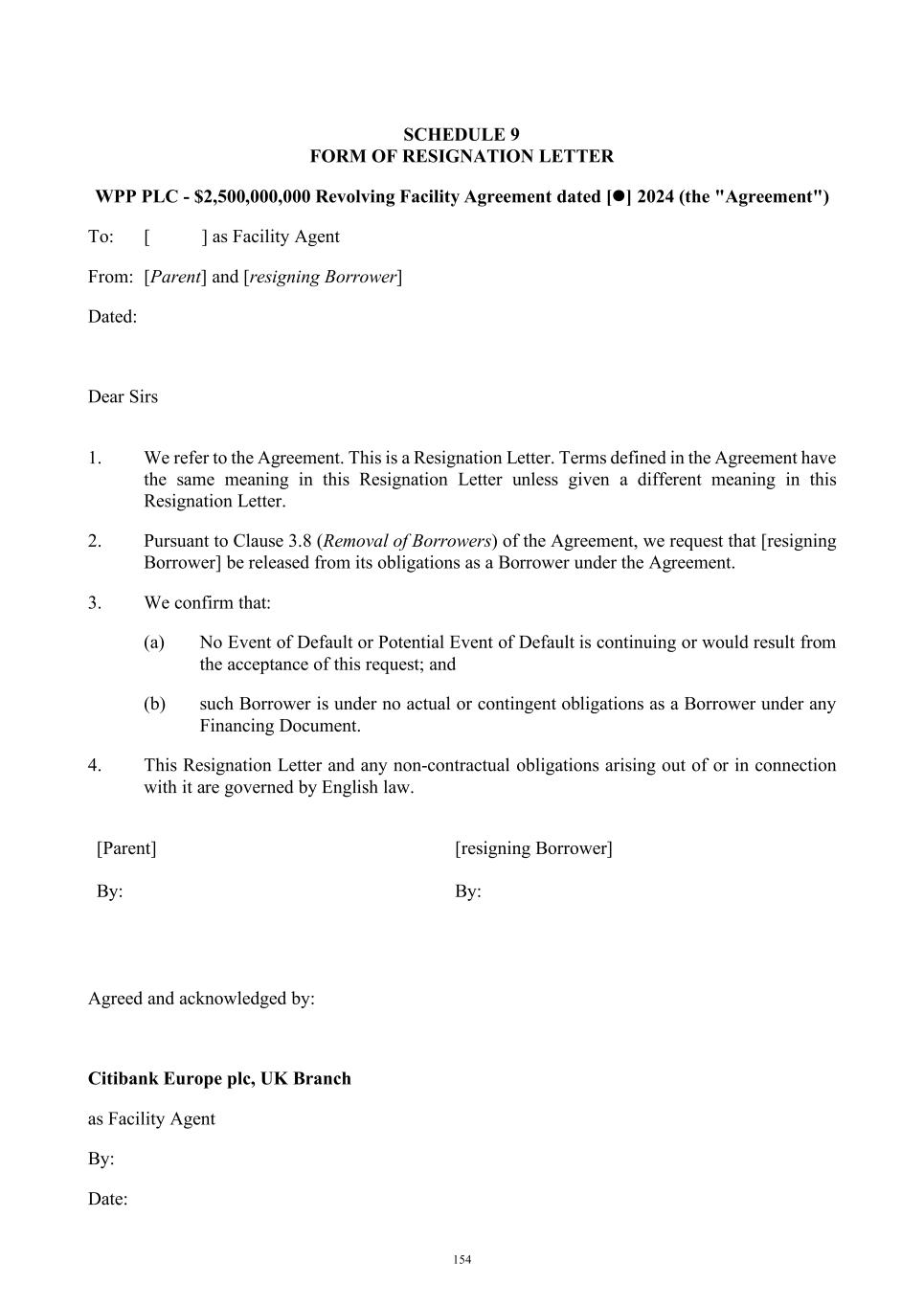 154 SCHEDULE 9 FORM OF RESIGNATION LETTER WPP PLC - $2,500,000,000 Revolving Facility Agreement dated [] 2024 (the "Agreement") To: [ ] as Facility Agent From: [Parent] and [resigning Borrower] Dated: Dear Sirs 1. We refer to the Agreement. This is a Resignation Letter. Terms defined in the Agreement have the same meaning in this Resignation Letter unless given a different meaning in this Resignation Letter. 2. Pursuant to Clause 3.8 (Removal of Borrowers) of the Agreement, we request that [resigning Borrower] be released from its obligations as a Borrower under the Agreement. 3. We confirm that: (a) No Event of Default or Potential Event of Default is continuing or would result from the acceptance of this request; and (b) such Borrower is under no actual or contingent obligations as a Borrower under any Financing Document. 4. This Resignation Letter and any non-contractual obligations arising out of or in connection with it are governed by English law. [Parent] [resigning Borrower] By: By: Agreed and acknowledged by: Citibank Europe plc, UK Branch as Facility Agent By: Date:
