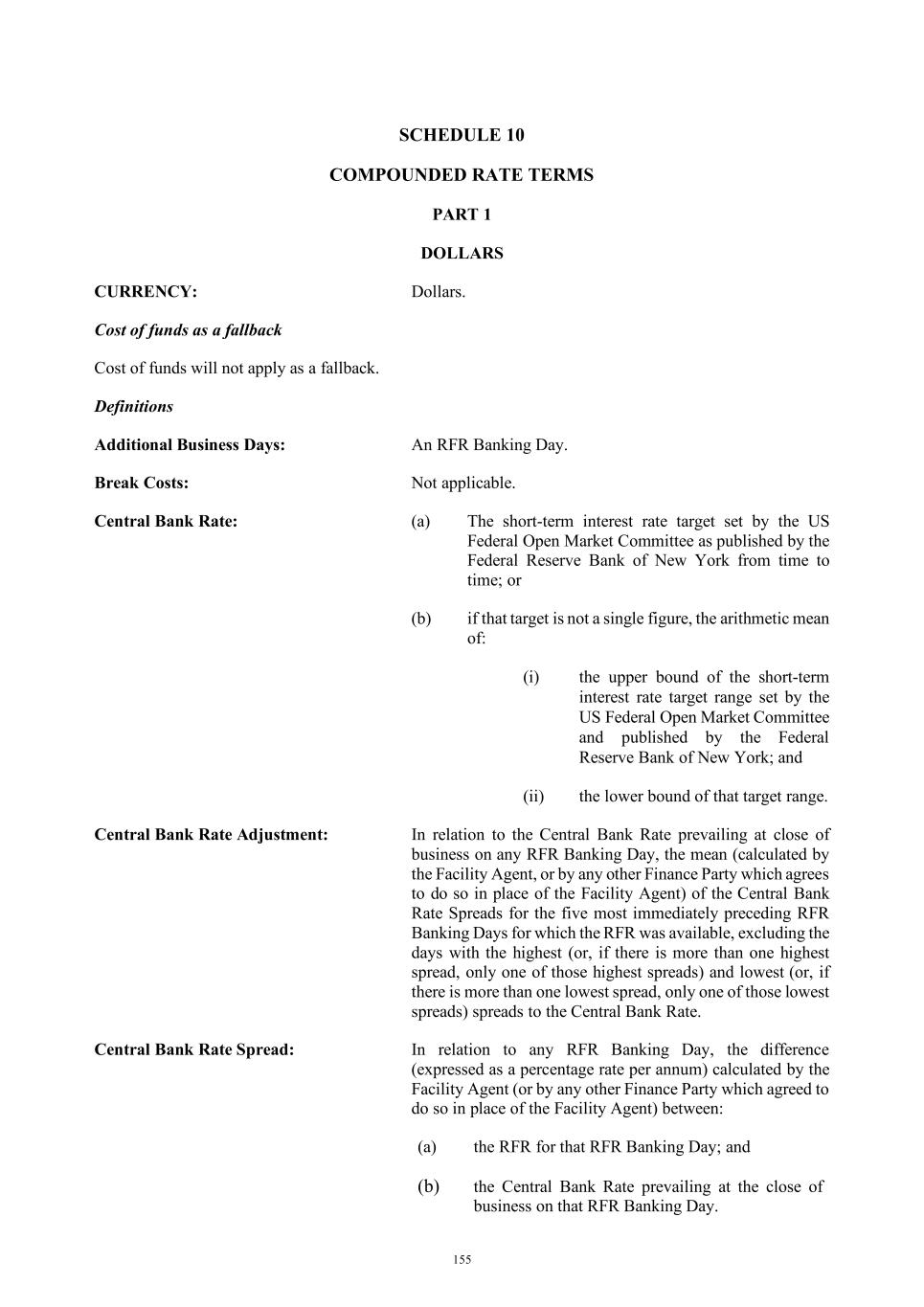 155 SCHEDULE 10 COMPOUNDED RATE TERMS PART 1 DOLLARS CURRENCY: Dollars. Cost of funds as a fallback Cost of funds will not apply as a fallback. Definitions Additional Business Days: An RFR Banking Day. Break Costs: Not applicable. Central Bank Rate: (a) The short-term interest rate target set by the US Federal Open Market Committee as published by the Federal Reserve Bank of New York from time to time; or (b) if that target is not a single figure, the arithmetic mean of: (i) the upper bound of the short-term interest rate target range set by the US Federal Open Market Committee and published by the Federal Reserve Bank of New York; and (ii) the lower bound of that target range. Central Bank Rate Adjustment: In relation to the Central Bank Rate prevailing at close of business on any RFR Banking Day, the mean (calculated by the Facility Agent, or by any other Finance Party which agrees to do so in place of the Facility Agent) of the Central Bank Rate Spreads for the five most immediately preceding RFR Banking Days for which the RFR was available, excluding the days with the highest (or, if there is more than one highest spread, only one of those highest spreads) and lowest (or, if there is more than one lowest spread, only one of those lowest spreads) spreads to the Central Bank Rate. Central Bank Rate Spread: In relation to any RFR Banking Day, the difference (expressed as a percentage rate per annum) calculated by the Facility Agent (or by any other Finance Party which agreed to do so in place of the Facility Agent) between: (a) the RFR for that RFR Banking Day; and (b) the Central Bank Rate prevailing at the close of business on that RFR Banking Day.