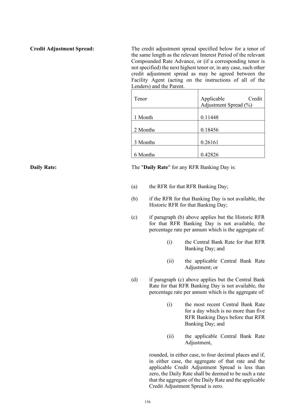 156 Credit Adjustment Spread: The credit adjustment spread specified below for a tenor of the same length as the relevant Interest Period of the relevant Compounded Rate Advance, or (if a corresponding tenor is not specified) the next highest tenor or, in any case, such other credit adjustment spread as may be agreed between the Facility Agent (acting on the instructions of all of the Lenders) and the Parent. Tenor Applicable Credit Adjustment Spread (%) 1 Month 0.11448 2 Months 0.18456 3 Months 0.26161 6 Months 0.42826 Daily Rate: The "Daily Rate" for any RFR Banking Day is: (a) the RFR for that RFR Banking Day; (b) if the RFR for that Banking Day is not available, the Historic RFR for that Banking Day; (c) if paragraph (b) above applies but the Historic RFR for that RFR Banking Day is not available, the percentage rate per annum which is the aggregate of: (i) the Central Bank Rate for that RFR Banking Day; and (ii) the applicable Central Bank Rate Adjustment; or (d) if paragraph (c) above applies but the Central Bank Rate for that RFR Banking Day is not available, the percentage rate per annum which is the aggregate of: (i) the most recent Central Bank Rate for a day which is no more than five RFR Banking Days before that RFR Banking Day; and (ii) the applicable Central Bank Rate Adjustment, rounded, in either case, to four decimal places and if, in either case, the aggregate of that rate and the applicable Credit Adjustment Spread is less than zero, the Daily Rate shall be deemed to be such a rate that the aggregate of the Daily Rate and the applicable Credit Adjustment Spread is zero.