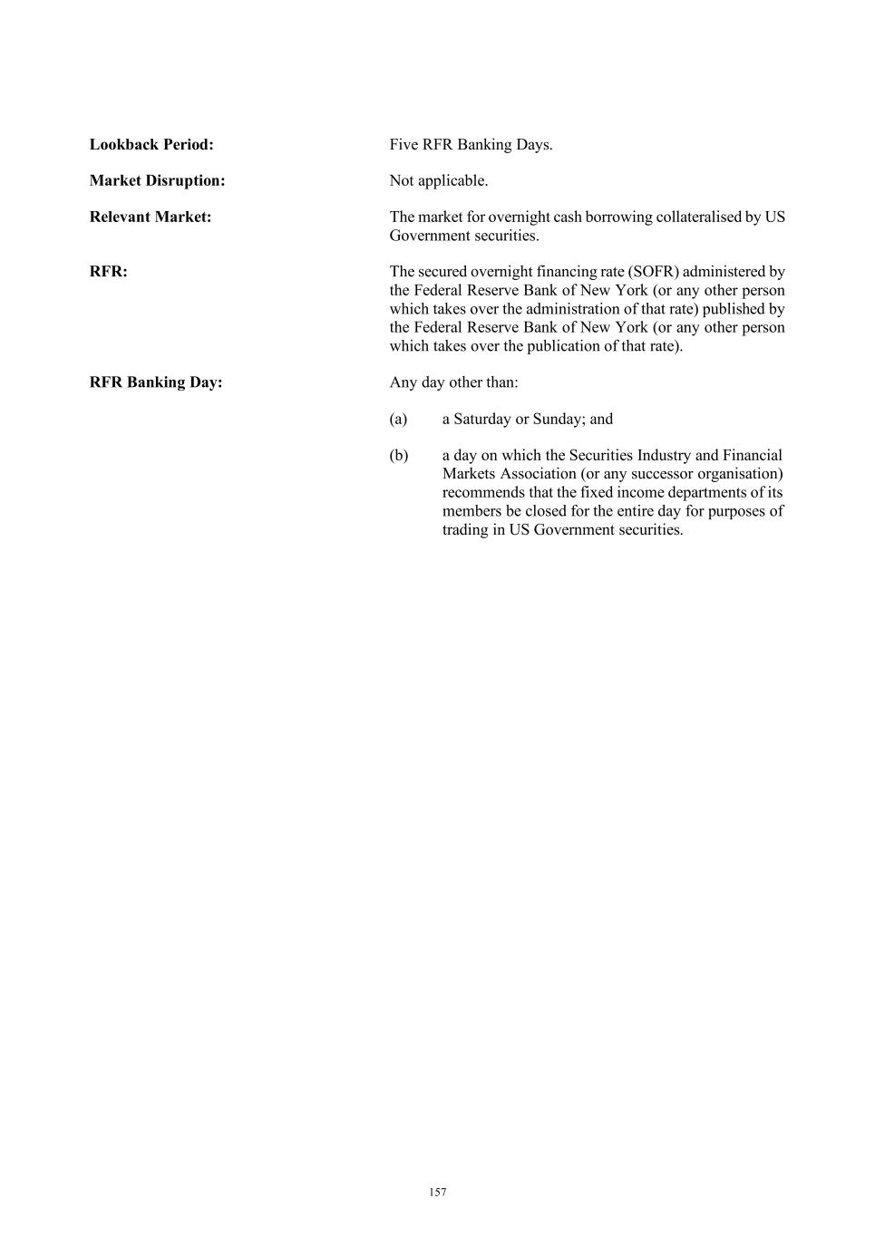 157 Lookback Period: Five RFR Banking Days. Market Disruption: Relevant Market: Not applicable. The market for overnight cash borrowing collateralised by US Government securities. RFR: The secured overnight financing rate (SOFR) administered by the Federal Reserve Bank of New York (or any other person which takes over the administration of that rate) published by the Federal Reserve Bank of New York (or any other person which takes over the publication of that rate). RFR Banking Day: Any day other than: (a) a Saturday or Sunday; and (b) a day on which the Securities Industry and Financial Markets Association (or any successor organisation) recommends that the fixed income departments of its members be closed for the entire day for purposes of trading in US Government securities.