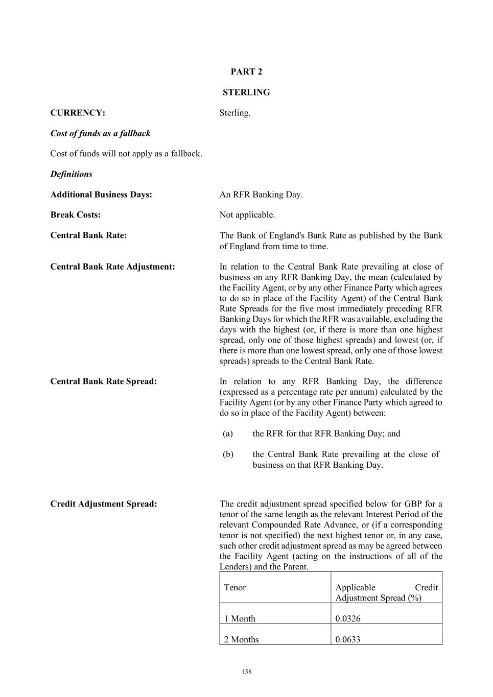 158 PART 2 STERLING CURRENCY: Sterling. Cost of funds as a fallback Cost of funds will not apply as a fallback. Definitions Additional Business Days: An RFR Banking Day. Break Costs: Not applicable. Central Bank Rate: The Bank of England's Bank Rate as published by the Bank of England from time to time. Central Bank Rate Adjustment: In relation to the Central Bank Rate prevailing at close of business on any RFR Banking Day, the mean (calculated by the Facility Agent, or by any other Finance Party which agrees to do so in place of the Facility Agent) of the Central Bank Rate Spreads for the five most immediately preceding RFR Banking Days for which the RFR was available, excluding the days with the highest (or, if there is more than one highest spread, only one of those highest spreads) and lowest (or, if there is more than one lowest spread, only one of those lowest spreads) spreads to the Central Bank Rate. Central Bank Rate Spread: In relation to any RFR Banking Day, the difference (expressed as a percentage rate per annum) calculated by the Facility Agent (or by any other Finance Party which agreed to do so in place of the Facility Agent) between: (a) the RFR for that RFR Banking Day; and (b) the Central Bank Rate prevailing at the close of business on that RFR Banking Day. Credit Adjustment Spread: The credit adjustment spread specified below for GBP for a tenor of the same length as the relevant Interest Period of the relevant Compounded Rate Advance, or (if a corresponding tenor is not specified) the next highest tenor or, in any case, such other credit adjustment spread as may be agreed between the Facility Agent (acting on the instructions of all of the Lenders) and the Parent. Tenor Applicable Credit Adjustment Spread (%) 1 Month 0.0326 2 Months 0.0633