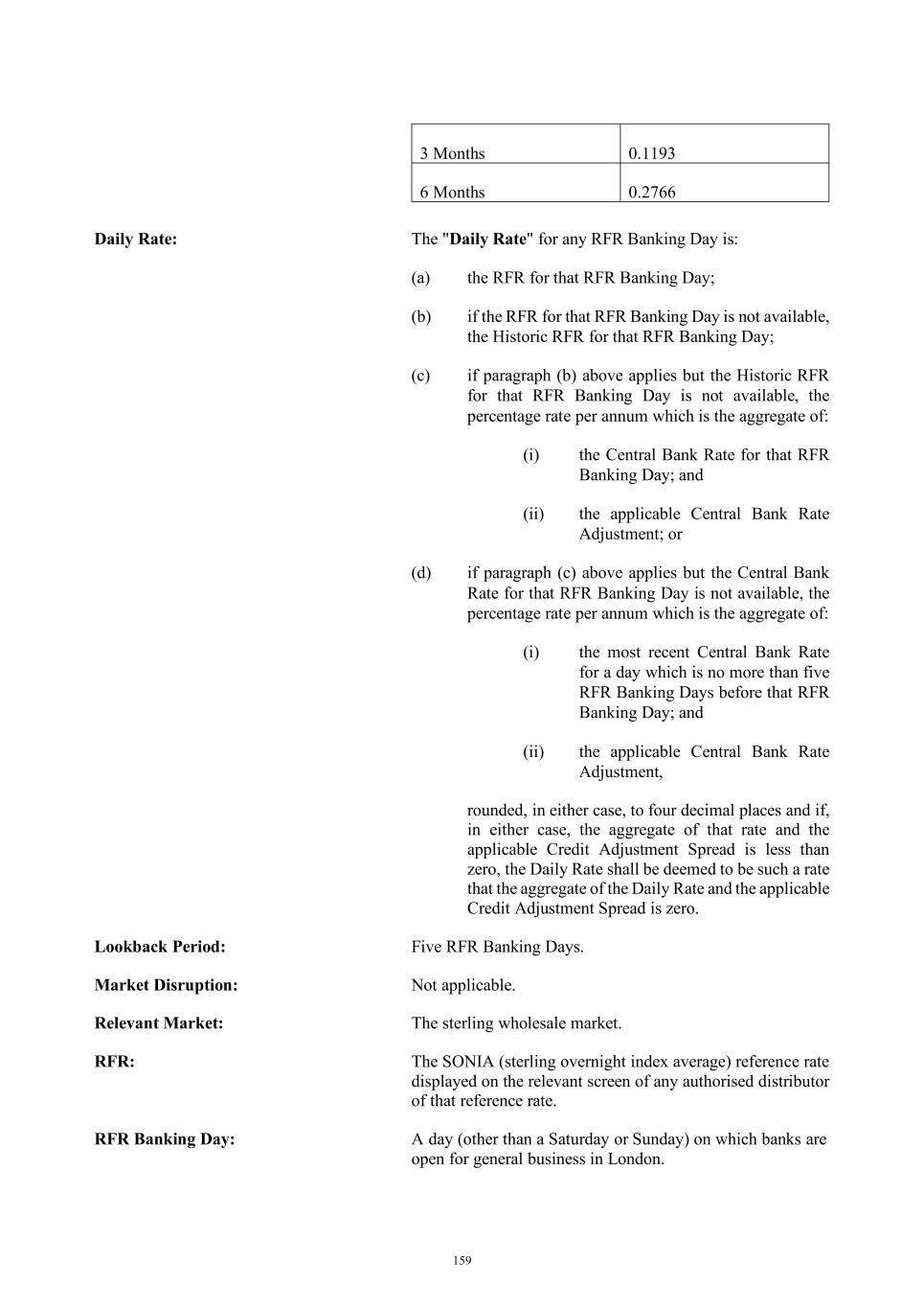 159 3 Months 0.1193 6 Months 0.2766 Daily Rate: The "Daily Rate" for any RFR Banking Day is: (a) the RFR for that RFR Banking Day; (b) if the RFR for that RFR Banking Day is not available, the Historic RFR for that RFR Banking Day; (c) if paragraph (b) above applies but the Historic RFR for that RFR Banking Day is not available, the percentage rate per annum which is the aggregate of: (i) the Central Bank Rate for that RFR Banking Day; and (ii) the applicable Central Bank Rate Adjustment; or (d) if paragraph (c) above applies but the Central Bank Rate for that RFR Banking Day is not available, the percentage rate per annum which is the aggregate of: (i) the most recent Central Bank Rate for a day which is no more than five RFR Banking Days before that RFR Banking Day; and (ii) the applicable Central Bank Rate Adjustment, rounded, in either case, to four decimal places and if, in either case, the aggregate of that rate and the applicable Credit Adjustment Spread is less than zero, the Daily Rate shall be deemed to be such a rate that the aggregate of the Daily Rate and the applicable Credit Adjustment Spread is zero. Lookback Period: Five RFR Banking Days. Market Disruption: Relevant Market: Not applicable. The sterling wholesale market. RFR: The SONIA (sterling overnight index average) reference rate displayed on the relevant screen of any authorised distributor of that reference rate. RFR Banking Day: A day (other than a Saturday or Sunday) on which banks are open for general business in London.