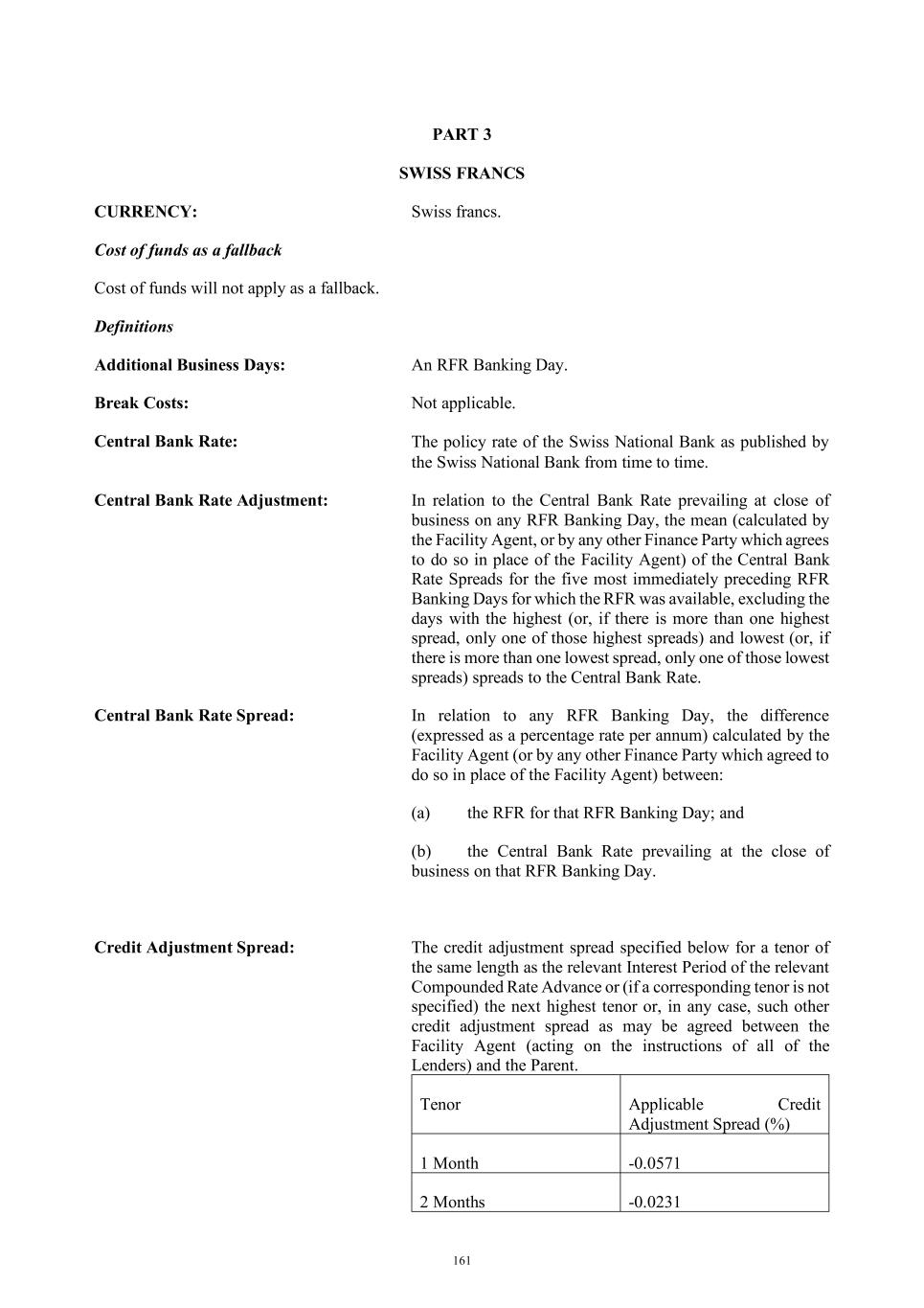 161 PART 3 SWISS FRANCS CURRENCY: Swiss francs. Cost of funds as a fallback Cost of funds will not apply as a fallback. Definitions Additional Business Days: An RFR Banking Day. Break Costs: Not applicable. Central Bank Rate: The policy rate of the Swiss National Bank as published by the Swiss National Bank from time to time. Central Bank Rate Adjustment: In relation to the Central Bank Rate prevailing at close of business on any RFR Banking Day, the mean (calculated by the Facility Agent, or by any other Finance Party which agrees to do so in place of the Facility Agent) of the Central Bank Rate Spreads for the five most immediately preceding RFR Banking Days for which the RFR was available, excluding the days with the highest (or, if there is more than one highest spread, only one of those highest spreads) and lowest (or, if there is more than one lowest spread, only one of those lowest spreads) spreads to the Central Bank Rate. Central Bank Rate Spread: In relation to any RFR Banking Day, the difference (expressed as a percentage rate per annum) calculated by the Facility Agent (or by any other Finance Party which agreed to do so in place of the Facility Agent) between: (a) the RFR for that RFR Banking Day; and (b) the Central Bank Rate prevailing at the close of business on that RFR Banking Day. Credit Adjustment Spread: The credit adjustment spread specified below for a tenor of the same length as the relevant Interest Period of the relevant Compounded Rate Advance or (if a corresponding tenor is not specified) the next highest tenor or, in any case, such other credit adjustment spread as may be agreed between the Facility Agent (acting on the instructions of all of the Lenders) and the Parent. Tenor Applicable Credit Adjustment Spread (%) 1 Month -0.0571 2 Months -0.0231