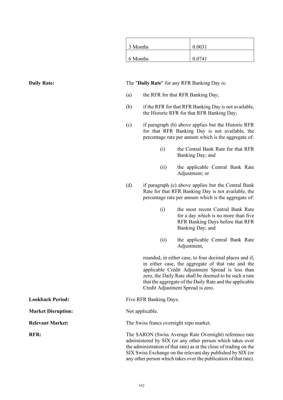 162 3 Months 0.0031 6 Months 0.0741 Daily Rate: The "Daily Rate" for any RFR Banking Day is: (a) the RFR for that RFR Banking Day; (b) if the RFR for that RFR Banking Day is not available, the Historic RFR for that RFR Banking Day; (c) if paragraph (b) above applies but the Historic RFR for that RFR Banking Day is not available, the percentage rate per annum which is the aggregate of: (i) the Central Bank Rate for that RFR Banking Day; and (ii) the applicable Central Bank Rate Adjustment; or (d) if paragraph (c) above applies but the Central Bank Rate for that RFR Banking Day is not available, the percentage rate per annum which is the aggregate of: (i) the most recent Central Bank Rate for a day which is no more than five RFR Banking Days before that RFR Banking Day; and (ii) the applicable Central Bank Rate Adjustment, rounded, in either case, to four decimal places and if, in either case, the aggregate of that rate and the applicable Credit Adjustment Spread is less than zero, the Daily Rate shall be deemed to be such a rate that the aggregate of the Daily Rate and the applicable Credit Adjustment Spread is zero. Lookback Period: Five RFR Banking Days. Market Disruption: Relevant Market: Not applicable. The Swiss francs overnight repo market. RFR: The SARON (Swiss Average Rate Overnight) reference rate administered by SIX (or any other person which takes over the administration of that rate) as at the close of trading on the SIX Swiss Exchange on the relevant day published by SIX (or any other person which takes over the publication of that rate).