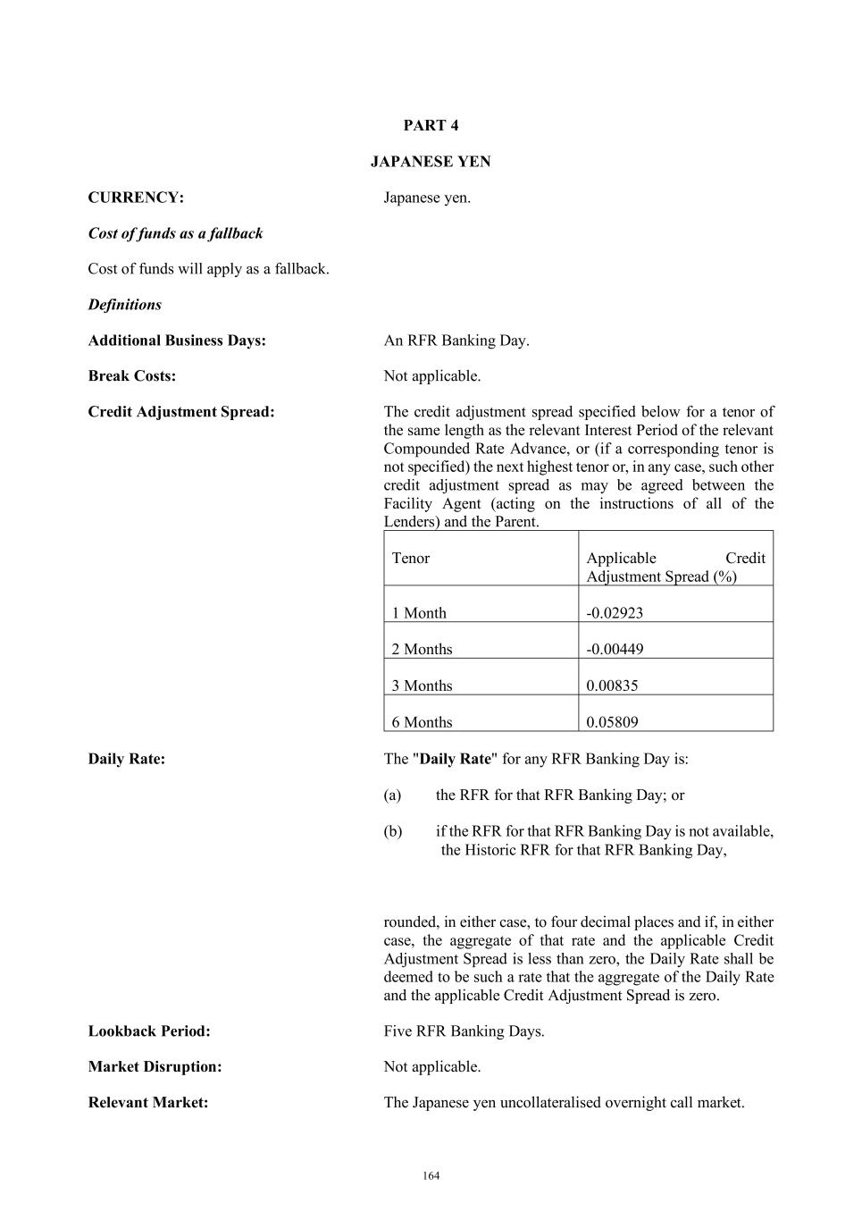 164 PART 4 JAPANESE YEN CURRENCY: Japanese yen. Cost of funds as a fallback Cost of funds will apply as a fallback. Definitions Additional Business Days: An RFR Banking Day. Break Costs: Not applicable. Credit Adjustment Spread: The credit adjustment spread specified below for a tenor of the same length as the relevant Interest Period of the relevant Compounded Rate Advance, or (if a corresponding tenor is not specified) the next highest tenor or, in any case, such other credit adjustment spread as may be agreed between the Facility Agent (acting on the instructions of all of the Lenders) and the Parent. Tenor Applicable Credit Adjustment Spread (%) 1 Month -0.02923 2 Months -0.00449 3 Months 0.00835 6 Months 0.05809 Daily Rate: The "Daily Rate" for any RFR Banking Day is: (a) the RFR for that RFR Banking Day; or (b) if the RFR for that RFR Banking Day is not available, the Historic RFR for that RFR Banking Day, rounded, in either case, to four decimal places and if, in either case, the aggregate of that rate and the applicable Credit Adjustment Spread is less than zero, the Daily Rate shall be deemed to be such a rate that the aggregate of the Daily Rate and the applicable Credit Adjustment Spread is zero. Lookback Period: Five RFR Banking Days. Market Disruption: Relevant Market: Not applicable. The Japanese yen uncollateralised overnight call market.
