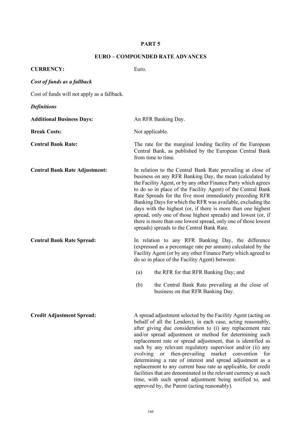 166 PART 5 EURO – COMPOUNDED RATE ADVANCES CURRENCY: Euro. Cost of funds as a fallback Cost of funds will not apply as a fallback. Definitions Additional Business Days: An RFR Banking Day. Break Costs: Not applicable. Central Bank Rate: The rate for the marginal lending facility of the European Central Bank, as published by the European Central Bank from time to time. Central Bank Rate Adjustment: In relation to the Central Bank Rate prevailing at close of business on any RFR Banking Day, the mean (calculated by the Facility Agent, or by any other Finance Party which agrees to do so in place of the Facility Agent) of the Central Bank Rate Spreads for the five most immediately preceding RFR Banking Days for which the RFR was available, excluding the days with the highest (or, if there is more than one highest spread, only one of those highest spreads) and lowest (or, if there is more than one lowest spread, only one of those lowest spreads) spreads to the Central Bank Rate. Central Bank Rate Spread: In relation to any RFR Banking Day, the difference (expressed as a percentage rate per annum) calculated by the Facility Agent (or by any other Finance Party which agreed to do so in place of the Facility Agent) between: (a) the RFR for that RFR Banking Day; and (b) the Central Bank Rate prevailing at the close of business on that RFR Banking Day. Credit Adjustment Spread: A spread adjustment selected by the Facility Agent (acting on behalf of all the Lenders), in each case, acting reasonably, after giving due consideration to (i) any replacement rate and/or spread adjustment or method for determining such replacement rate or spread adjustment, that is identified as such by any relevant regulatory supervisor and/or (ii) any evolving or then-prevailing market convention for determining a rate of interest and spread adjustment as a replacement to any current base rate as applicable, for credit facilities that are denominated in the relevant currency at such time, with such spread adjustment being notified to, and approved by, the Parent (acting reasonably).