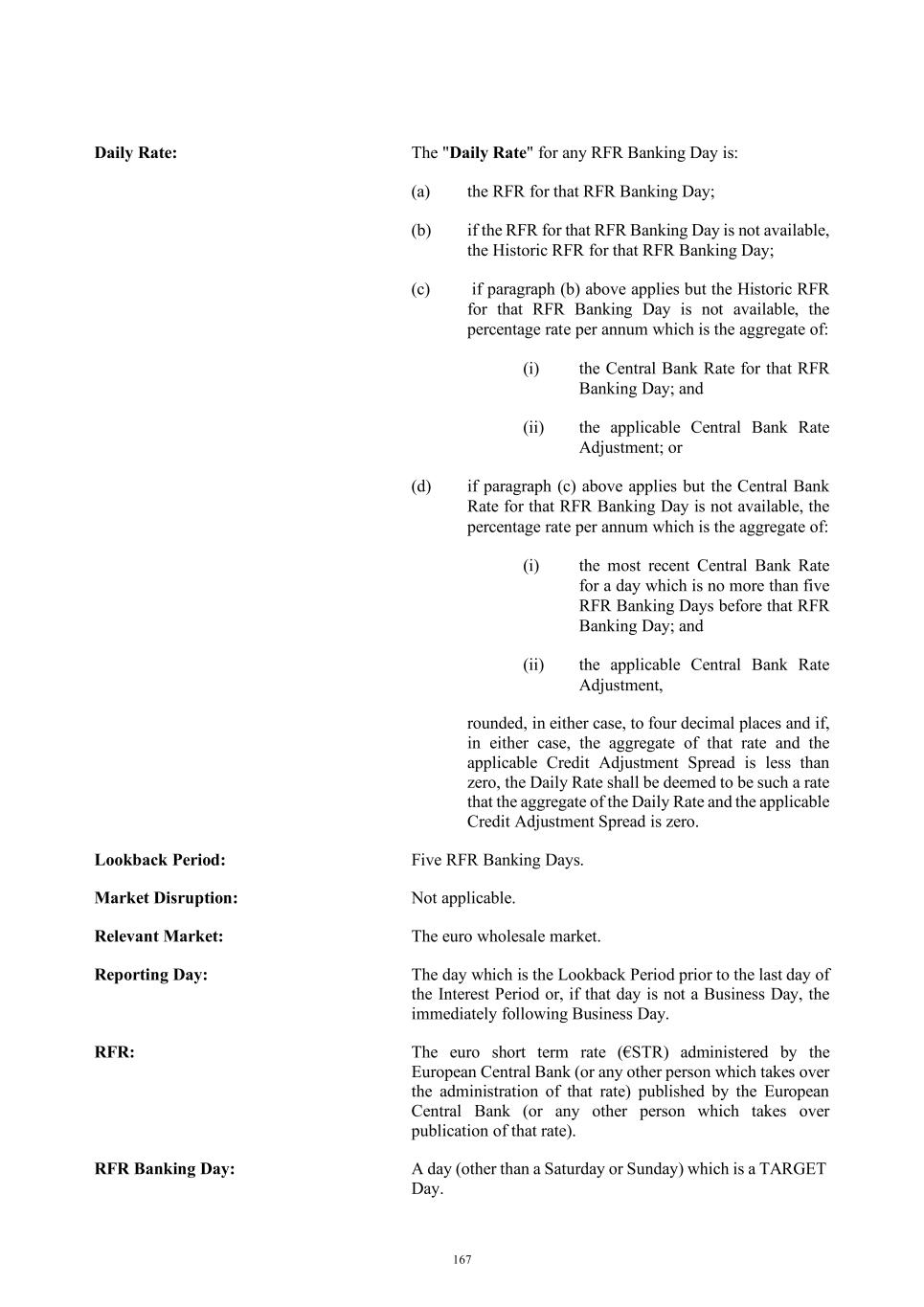 167 Daily Rate: The "Daily Rate" for any RFR Banking Day is: (a) the RFR for that RFR Banking Day; (b) if the RFR for that RFR Banking Day is not available, the Historic RFR for that RFR Banking Day; (c) if paragraph (b) above applies but the Historic RFR for that RFR Banking Day is not available, the percentage rate per annum which is the aggregate of: (i) the Central Bank Rate for that RFR Banking Day; and (ii) the applicable Central Bank Rate Adjustment; or (d) if paragraph (c) above applies but the Central Bank Rate for that RFR Banking Day is not available, the percentage rate per annum which is the aggregate of: (i) the most recent Central Bank Rate for a day which is no more than five RFR Banking Days before that RFR Banking Day; and (ii) the applicable Central Bank Rate Adjustment, rounded, in either case, to four decimal places and if, in either case, the aggregate of that rate and the applicable Credit Adjustment Spread is less than zero, the Daily Rate shall be deemed to be such a rate that the aggregate of the Daily Rate and the applicable Credit Adjustment Spread is zero. Lookback Period: Five RFR Banking Days. Market Disruption: Relevant Market: Not applicable. The euro wholesale market. Reporting Day: The day which is the Lookback Period prior to the last day of the Interest Period or, if that day is not a Business Day, the immediately following Business Day. RFR: The euro short term rate (€STR) administered by the European Central Bank (or any other person which takes over the administration of that rate) published by the European Central Bank (or any other person which takes over publication of that rate). RFR Banking Day: A day (other than a Saturday or Sunday) which is a TARGET Day.