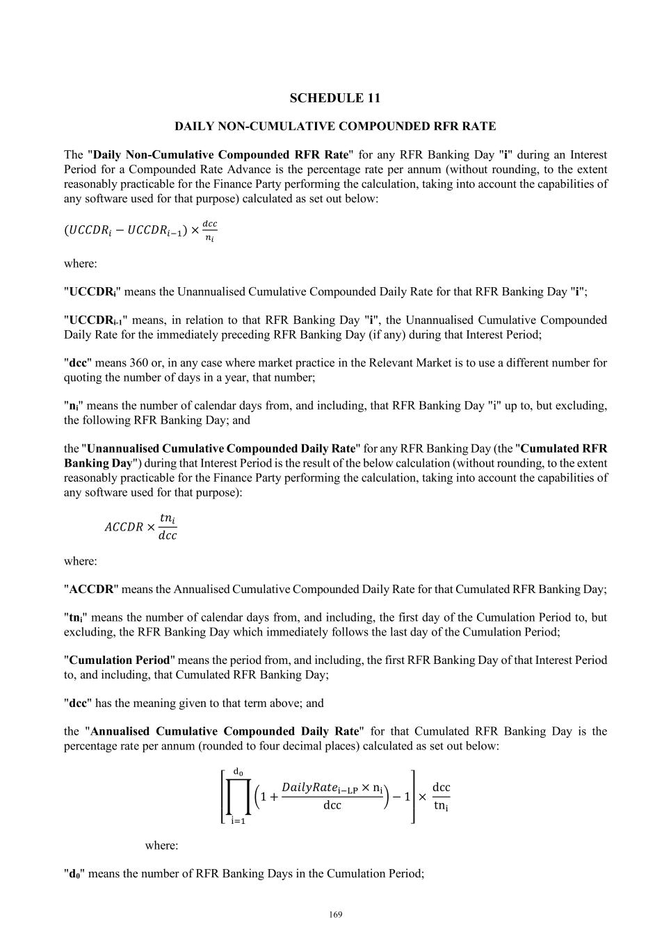 169 SCHEDULE 11 DAILY NON-CUMULATIVE COMPOUNDED RFR RATE The "Daily Non-Cumulative Compounded RFR Rate" for any RFR Banking Day "i" during an Interest Period for a Compounded Rate Advance is the percentage rate per annum (without rounding, to the extent reasonably practicable for the Finance Party performing the calculation, taking into account the capabilities of any software used for that purpose) calculated as set out below: (𝑈𝑈𝑈𝑈𝑈𝑈𝑈𝑈𝑈𝑈𝑖𝑖 − 𝑈𝑈𝑈𝑈𝑈𝑈𝑈𝑈𝑈𝑈𝑖𝑖−1) × 𝑑𝑑𝑑𝑑𝑑𝑑 𝑛𝑛𝑖𝑖 where: "UCCDRi" means the Unannualised Cumulative Compounded Daily Rate for that RFR Banking Day "i"; "UCCDRi-1" means, in relation to that RFR Banking Day "i", the Unannualised Cumulative Compounded Daily Rate for the immediately preceding RFR Banking Day (if any) during that Interest Period; "dcc" means 360 or, in any case where market practice in the Relevant Market is to use a different number for quoting the number of days in a year, that number; "ni" means the number of calendar days from, and including, that RFR Banking Day "i" up to, but excluding, the following RFR Banking Day; and the "Unannualised Cumulative Compounded Daily Rate" for any RFR Banking Day (the "Cumulated RFR Banking Day") during that Interest Period is the result of the below calculation (without rounding, to the extent reasonably practicable for the Finance Party performing the calculation, taking into account the capabilities of any software used for that purpose): 𝐴𝐴𝑈𝑈𝑈𝑈𝑈𝑈𝑈𝑈 × 𝑡𝑡𝑡𝑡𝑖𝑖 𝑑𝑑𝑑𝑑𝑑𝑑 where: "ACCDR" means the Annualised Cumulative Compounded Daily Rate for that Cumulated RFR Banking Day; "tni" means the number of calendar days from, and including, the first day of the Cumulation Period to, but excluding, the RFR Banking Day which immediately follows the last day of the Cumulation Period; "Cumulation Period" means the period from, and including, the first RFR Banking Day of that Interest Period to, and including, that Cumulated RFR Banking Day; "dcc" has the meaning given to that term above; and the "Annualised Cumulative Compounded Daily Rate" for that Cumulated RFR Banking Day is the percentage rate per annum (rounded to four decimal places) calculated as set out below: ⎣ ⎢ ⎢ ⎡ ��1 + 𝑈𝑈𝐷𝐷𝐷𝐷𝐷𝐷𝐷𝐷𝑈𝑈𝐷𝐷𝑡𝑡𝐷𝐷i−LP × ni dcc � d0 i̇=1 − 1 ⎦ ⎥ ⎥ ⎤ × dcc tni where: "d0" means the number of RFR Banking Days in the Cumulation Period;