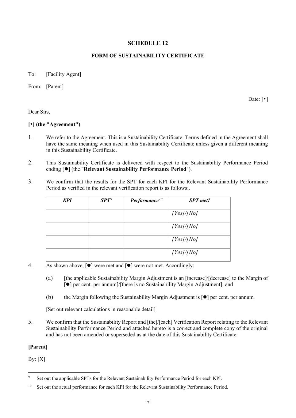 171 SCHEDULE 12 FORM OF SUSTAINABILITY CERTIFICATE To: [Facility Agent] From: [Parent] Date: [•] Dear Sirs, [•] (the "Agreement") 1. We refer to the Agreement. This is a Sustainability Certificate. Terms defined in the Agreement shall have the same meaning when used in this Sustainability Certificate unless given a different meaning in this Sustainability Certificate. 2. This Sustainability Certificate is delivered with respect to the Sustainability Performance Period ending [] (the "Relevant Sustainability Performance Period"). 3. We confirm that the results for the SPT for each KPI for the Relevant Sustainability Performance Period as verified in the relevant verification report is as follows:. KPI SPT9 Performance10 SPT met? [Yes]/[No] [Yes]/[No] [Yes]/[No] [Yes]/[No] 4. As shown above, [] were met and [] were not met. Accordingly: (a) [the applicable Sustainability Margin Adjustment is an [increase]/[decrease] to the Margin of [] per cent. per annum]/[there is no Sustainability Margin Adjustment]; and (b) the Margin following the Sustainability Margin Adjustment is [] per cent. per annum. [Set out relevant calculations in reasonable detail] 5. We confirm that the Sustainability Report and [the]/[each] Verification Report relating to the Relevant Sustainability Performance Period and attached hereto is a correct and complete copy of the original and has not been amended or superseded as at the date of this Sustainability Certificate. [Parent] By: [X] 9 Set out the applicable SPTs for the Relevant Sustainability Performance Period for each KPI. 10 Set out the actual performance for each KPI for the Relevant Sustainability Performance Period.