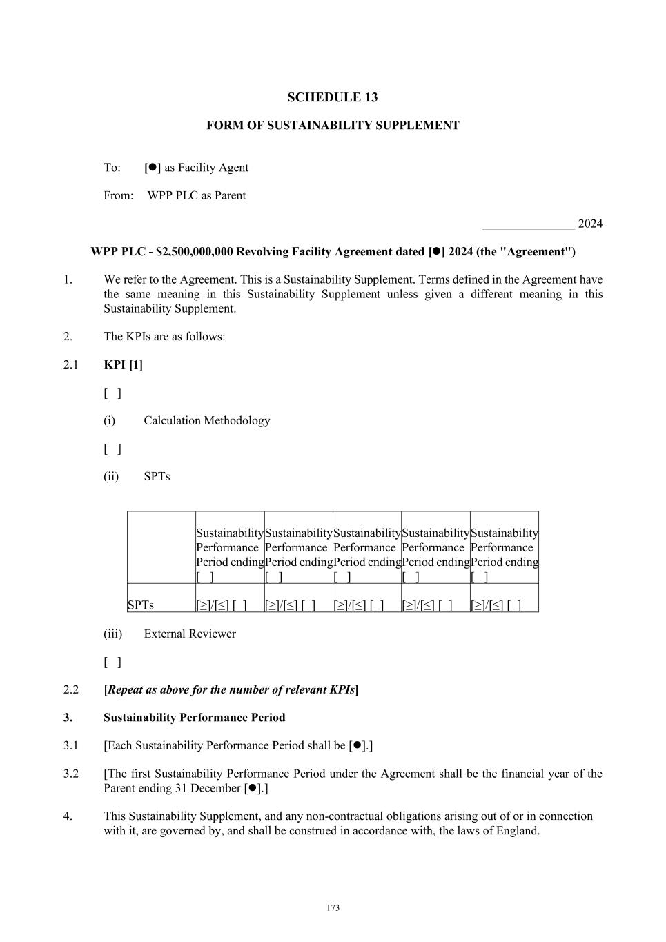 173 SCHEDULE 13 FORM OF SUSTAINABILITY SUPPLEMENT To: [] as Facility Agent From: WPP PLC as Parent _______________ 2024 WPP PLC - $2,500,000,000 Revolving Facility Agreement dated [] 2024 (the "Agreement") 1. We refer to the Agreement. This is a Sustainability Supplement. Terms defined in the Agreement have the same meaning in this Sustainability Supplement unless given a different meaning in this Sustainability Supplement. 2. The KPIs are as follows: 2.1 KPI [1] [ ] (i) Calculation Methodology [ ] (ii) SPTs Sustainability Performance Period ending [ ] Sustainability Performance Period ending [ ] Sustainability Performance Period ending [ ] Sustainability Performance Period ending [ ] Sustainability Performance Period ending [ ] SPTs [≥]/[≤] [ ] [≥]/[≤] [ ] [≥]/[≤] [ ] [≥]/[≤] [ ] [≥]/[≤] [ ] (iii) External Reviewer [ ] 2.2 [Repeat as above for the number of relevant KPIs] 3. Sustainability Performance Period 3.1 [Each Sustainability Performance Period shall be [].] 3.2 [The first Sustainability Performance Period under the Agreement shall be the financial year of the Parent ending 31 December [].] 4. This Sustainability Supplement, and any non-contractual obligations arising out of or in connection with it, are governed by, and shall be construed in accordance with, the laws of England.