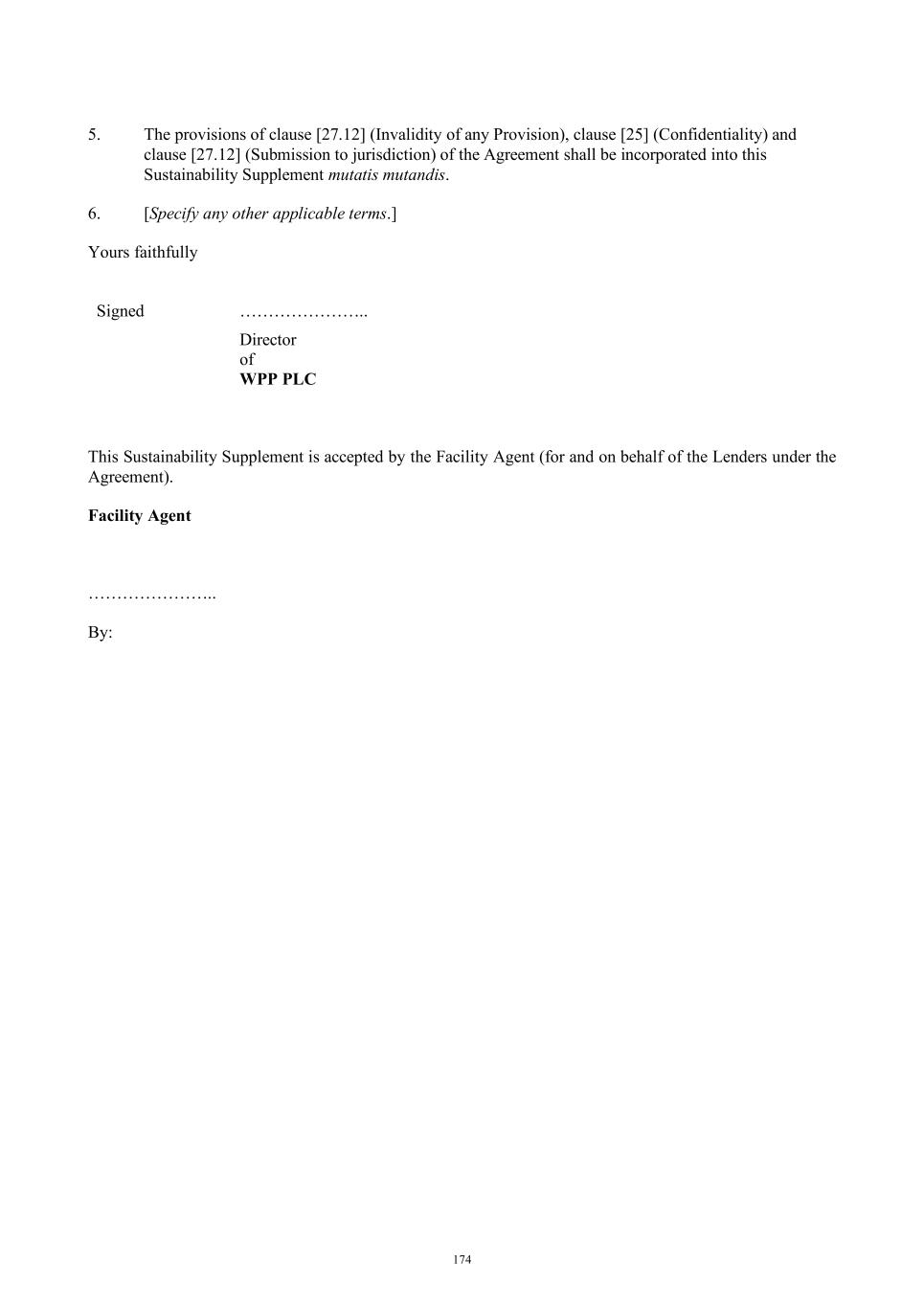 174 5. The provisions of clause [27.12] (Invalidity of any Provision), clause [25] (Confidentiality) and clause [27.12] (Submission to jurisdiction) of the Agreement shall be incorporated into this Sustainability Supplement mutatis mutandis. 6. [Specify any other applicable terms.] Yours faithfully Signed ………………….. Director of WPP PLC This Sustainability Supplement is accepted by the Facility Agent (for and on behalf of the Lenders under the Agreement). Facility Agent ………………….. By: