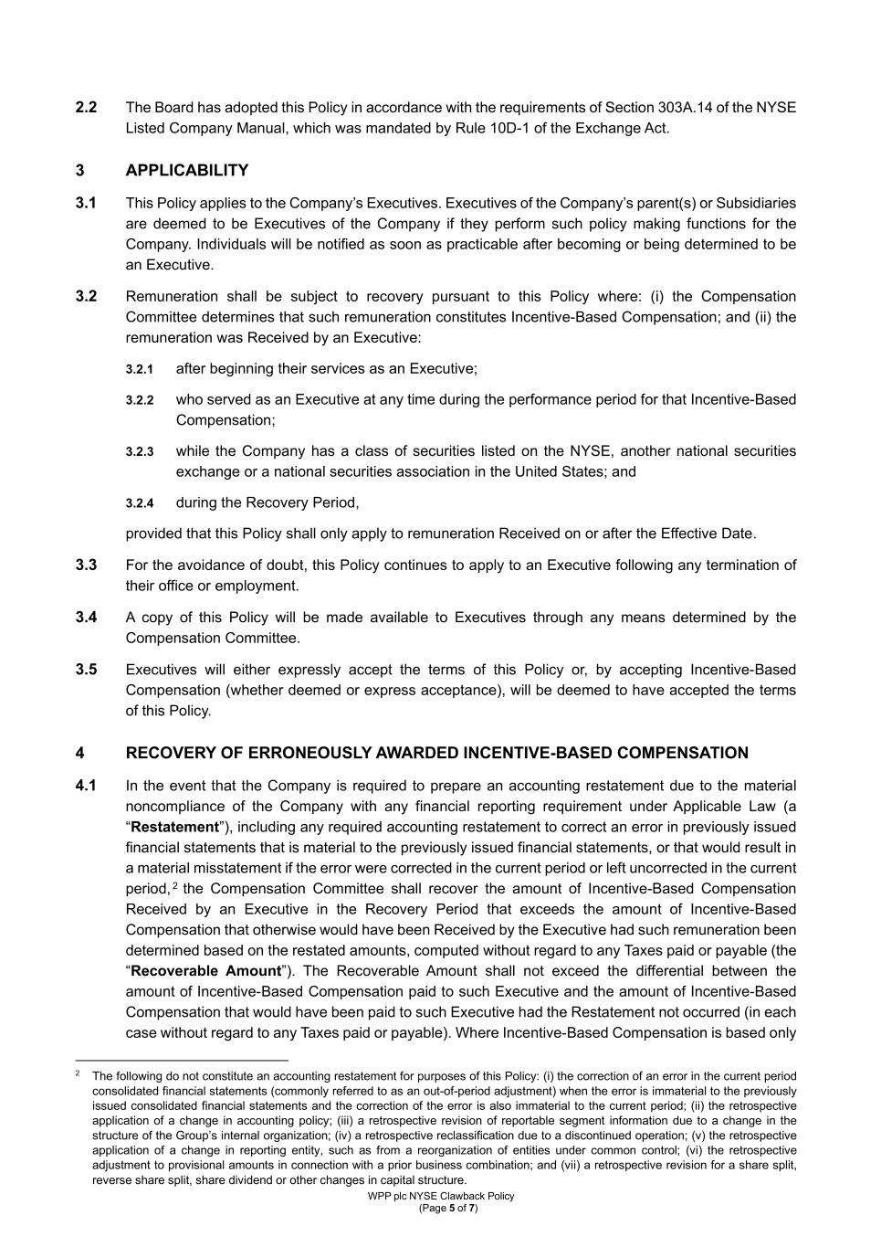 WPP plc NYSE Clawback Policy (Page 5 of 7) 2.2 The Board has adopted this Policy in accordance with the requirements of Section 303A.14 of the NYSE Listed Company Manual, which was mandated by Rule 10D-1 of the Exchange Act. 3 APPLICABILITY 3.1 This Policy applies to the Company’s Executives. Executives of the Company’s parent(s) or Subsidiaries are deemed to be Executives of the Company if they perform such policy making functions for the Company. Individuals will be notified as soon as practicable after becoming or being determined to be an Executive. 3.2 Remuneration shall be subject to recovery pursuant to this Policy where: (i) the Compensation Committee determines that such remuneration constitutes Incentive-Based Compensation; and (ii) the remuneration was Received by an Executive: 3.2.1 after beginning their services as an Executive; 3.2.2 who served as an Executive at any time during the performance period for that Incentive-Based Compensation; 3.2.3 while the Company has a class of securities listed on the NYSE, another national securities exchange or a national securities association in the United States; and 3.2.4 during the Recovery Period, provided that this Policy shall only apply to remuneration Received on or after the Effective Date. 3.3 For the avoidance of doubt, this Policy continues to apply to an Executive following any termination of their office or employment. 3.4 A copy of this Policy will be made available to Executives through any means determined by the Compensation Committee. 3.5 Executives will either expressly accept the terms of this Policy or, by accepting Incentive-Based Compensation (whether deemed or express acceptance), will be deemed to have accepted the terms of this Policy. 4 RECOVERY OF ERRONEOUSLY AWARDED INCENTIVE-BASED COMPENSATION 4.1 In the event that the Company is required to prepare an accounting restatement due to the material noncompliance of the Company with any financial reporting requirement under Applicable Law (a “Restatement”), including any required accounting restatement to correct an error in previously issued financial statements that is material to the previously issued financial statements, or that would result in a material misstatement if the error were corrected in the current period or left uncorrected in the current period, 2 the Compensation Committee shall recover the amount of Incentive-Based Compensation Received by an Executive in the Recovery Period that exceeds the amount of Incentive-Based Compensation that otherwise would have been Received by the Executive had such remuneration been determined based on the restated amounts, computed without regard to any Taxes paid or payable (the “Recoverable Amount”). The Recoverable Amount shall not exceed the differential between the amount of Incentive-Based Compensation paid to such Executive and the amount of Incentive-Based Compensation that would have been paid to such Executive had the Restatement not occurred (in each case without regard to any Taxes paid or payable). Where Incentive-Based Compensation is based only 2 The following do not constitute an accounting restatement for purposes of this Policy: (i) the correction of an error in the current period consolidated financial statements (commonly referred to as an out-of-period adjustment) when the error is immaterial to the previously issued consolidated financial statements and the correction of the error is also immaterial to the current period; (ii) the retrospective application of a change in accounting policy; (iii) a retrospective revision of reportable segment information due to a change in the structure of the Group’s internal organization; (iv) a retrospective reclassification due to a discontinued operation; (v) the retrospective application of a change in reporting entity, such as from a reorganization of entities under common control; (vi) the retrospective adjustment to provisional amounts in connection with a prior business combination; and (vii) a retrospective revision for a share split, reverse share split, share dividend or other changes in capital structure.
