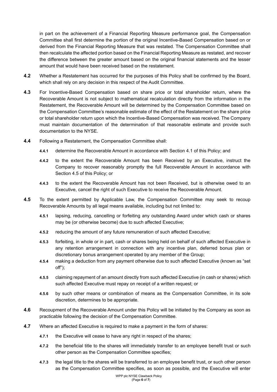 WPP plc NYSE Clawback Policy (Page 6 of 7) in part on the achievement of a Financial Reporting Measure performance goal, the Compensation Committee shall first determine the portion of the original Incentive-Based Compensation based on or derived from the Financial Reporting Measure that was restated. The Compensation Committee shall then recalculate the affected portion based on the Financial Reporting Measure as restated, and recover the difference between the greater amount based on the original financial statements and the lesser amount that would have been received based on the restatement. 4.2 Whether a Restatement has occurred for the purposes of this Policy shall be confirmed by the Board, which shall rely on any decision in this respect of the Audit Committee. 4.3 For Incentive-Based Compensation based on share price or total shareholder return, where the Recoverable Amount is not subject to mathematical recalculation directly from the information in the Restatement, the Recoverable Amount will be determined by the Compensation Committee based on the Compensation Committee’s reasonable estimate of the effect of the Restatement on the share price or total shareholder return upon which the Incentive-Based Compensation was received. The Company must maintain documentation of the determination of that reasonable estimate and provide such documentation to the NYSE. 4.4 Following a Restatement, the Compensation Committee shall: 4.4.1 determine the Recoverable Amount in accordance with Section 4.1 of this Policy; and 4.4.2 to the extent the Recoverable Amount has been Received by an Executive, instruct the Company to recover reasonably promptly the full Recoverable Amount in accordance with Section 4.5 of this Policy; or 4.4.3 to the extent the Recoverable Amount has not been Received, but is otherwise owed to an Executive, cancel the right of such Executive to receive the Recoverable Amount. 4.5 To the extent permitted by Applicable Law, the Compensation Committee may seek to recoup Recoverable Amounts by all legal means available, including but not limited to: 4.5.1 lapsing, reducing, cancelling or forfeiting any outstanding Award under which cash or shares may be (or otherwise become) due to such affected Executive; 4.5.2 reducing the amount of any future remuneration of such affected Executive; 4.5.3 forfeiting, in whole or in part, cash or shares being held on behalf of such affected Executive in any retention arrangement in connection with any incentive plan, deferred bonus plan or discretionary bonus arrangement operated by any member of the Group; 4.5.4 making a deduction from any payment otherwise due to such affected Executive (known as “set off”); 4.5.5 claiming repayment of an amount directly from such affected Executive (in cash or shares) which such affected Executive must repay on receipt of a written request; or 4.5.6 by such other means or combination of means as the Compensation Committee, in its sole discretion, determines to be appropriate. 4.6 Recoupment of the Recoverable Amount under this Policy will be initiated by the Company as soon as practicable following the decision of the Compensation Committee. 4.7 Where an affected Executive is required to make a payment in the form of shares: 4.7.1 the Executive will cease to have any right in respect of the shares; 4.7.2 the beneficial title to the shares will immediately transfer to an employee benefit trust or such other person as the Compensation Committee specifies; 4.7.3 the legal title to the shares will be transferred to an employee benefit trust, or such other person as the Compensation Committee specifies, as soon as possible, and the Executive will enter