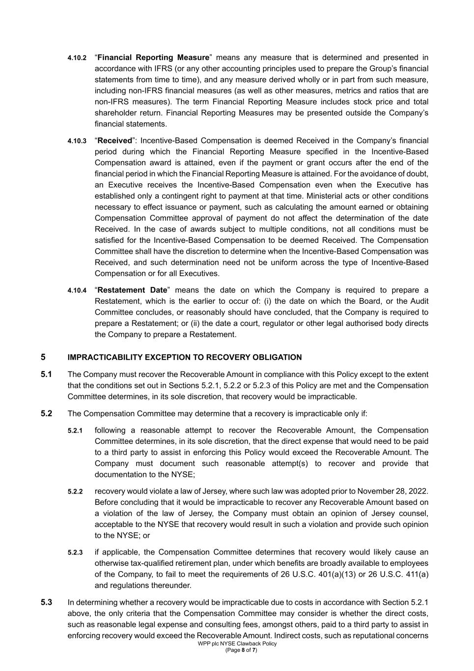WPP plc NYSE Clawback Policy (Page 8 of 7) 4.10.2 “Financial Reporting Measure” means any measure that is determined and presented in accordance with IFRS (or any other accounting principles used to prepare the Group’s financial statements from time to time), and any measure derived wholly or in part from such measure, including non-IFRS financial measures (as well as other measures, metrics and ratios that are non-IFRS measures). The term Financial Reporting Measure includes stock price and total shareholder return. Financial Reporting Measures may be presented outside the Company’s financial statements. 4.10.3 “Received”: Incentive-Based Compensation is deemed Received in the Company’s financial period during which the Financial Reporting Measure specified in the Incentive-Based Compensation award is attained, even if the payment or grant occurs after the end of the financial period in which the Financial Reporting Measure is attained. For the avoidance of doubt, an Executive receives the Incentive-Based Compensation even when the Executive has established only a contingent right to payment at that time. Ministerial acts or other conditions necessary to effect issuance or payment, such as calculating the amount earned or obtaining Compensation Committee approval of payment do not affect the determination of the date Received. In the case of awards subject to multiple conditions, not all conditions must be satisfied for the Incentive-Based Compensation to be deemed Received. The Compensation Committee shall have the discretion to determine when the Incentive-Based Compensation was Received, and such determination need not be uniform across the type of Incentive-Based Compensation or for all Executives. 4.10.4 “Restatement Date” means the date on which the Company is required to prepare a Restatement, which is the earlier to occur of: (i) the date on which the Board, or the Audit Committee concludes, or reasonably should have concluded, that the Company is required to prepare a Restatement; or (ii) the date a court, regulator or other legal authorised body directs the Company to prepare a Restatement. 5 IMPRACTICABILITY EXCEPTION TO RECOVERY OBLIGATION 5.1 The Company must recover the Recoverable Amount in compliance with this Policy except to the extent that the conditions set out in Sections 5.2.1, 5.2.2 or 5.2.3 of this Policy are met and the Compensation Committee determines, in its sole discretion, that recovery would be impracticable. 5.2 The Compensation Committee may determine that a recovery is impracticable only if: 5.2.1 following a reasonable attempt to recover the Recoverable Amount, the Compensation Committee determines, in its sole discretion, that the direct expense that would need to be paid to a third party to assist in enforcing this Policy would exceed the Recoverable Amount. The Company must document such reasonable attempt(s) to recover and provide that documentation to the NYSE; 5.2.2 recovery would violate a law of Jersey, where such law was adopted prior to November 28, 2022. Before concluding that it would be impracticable to recover any Recoverable Amount based on a violation of the law of Jersey, the Company must obtain an opinion of Jersey counsel, acceptable to the NYSE that recovery would result in such a violation and provide such opinion to the NYSE; or 5.2.3 if applicable, the Compensation Committee determines that recovery would likely cause an otherwise tax-qualified retirement plan, under which benefits are broadly available to employees of the Company, to fail to meet the requirements of 26 U.S.C. 401(a)(13) or 26 U.S.C. 411(a) and regulations thereunder. 5.3 In determining whether a recovery would be impracticable due to costs in accordance with Section 5.2.1 above, the only criteria that the Compensation Committee may consider is whether the direct costs, such as reasonable legal expense and consulting fees, amongst others, paid to a third party to assist in enforcing recovery would exceed the Recoverable Amount. Indirect costs, such as reputational concerns