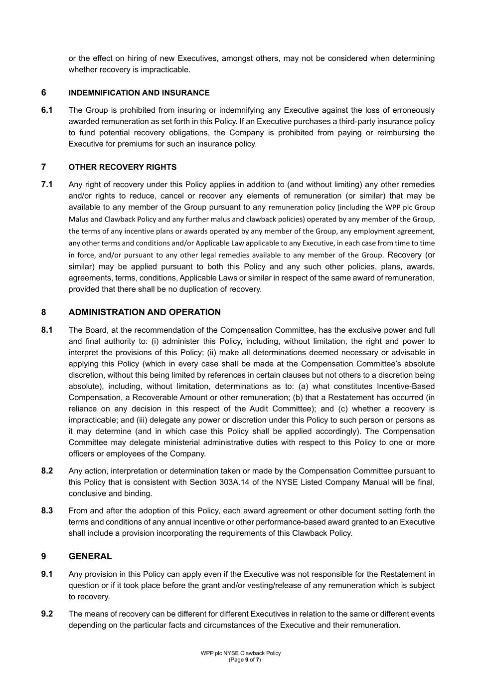 WPP plc NYSE Clawback Policy (Page 9 of 7) or the effect on hiring of new Executives, amongst others, may not be considered when determining whether recovery is impracticable. 6 INDEMNIFICATION AND INSURANCE 6.1 The Group is prohibited from insuring or indemnifying any Executive against the loss of erroneously awarded remuneration as set forth in this Policy. If an Executive purchases a third-party insurance policy to fund potential recovery obligations, the Company is prohibited from paying or reimbursing the Executive for premiums for such an insurance policy. 7 OTHER RECOVERY RIGHTS 7.1 Any right of recovery under this Policy applies in addition to (and without limiting) any other remedies and/or rights to reduce, cancel or recover any elements of remuneration (or similar) that may be available to any member of the Group pursuant to any remuneration policy (including the WPP plc Group Malus and Clawback Policy and any further malus and clawback policies) operated by any member of the Group, the terms of any incentive plans or awards operated by any member of the Group, any employment agreement, any other terms and conditions and/or Applicable Law applicable to any Executive, in each case from time to time in force, and/or pursuant to any other legal remedies available to any member of the Group. Recovery (or similar) may be applied pursuant to both this Policy and any such other policies, plans, awards, agreements, terms, conditions, Applicable Laws or similar in respect of the same award of remuneration, provided that there shall be no duplication of recovery. 8 ADMINISTRATION AND OPERATION 8.1 The Board, at the recommendation of the Compensation Committee, has the exclusive power and full and final authority to: (i) administer this Policy, including, without limitation, the right and power to interpret the provisions of this Policy; (ii) make all determinations deemed necessary or advisable in applying this Policy (which in every case shall be made at the Compensation Committee’s absolute discretion, without this being limited by references in certain clauses but not others to a discretion being absolute), including, without limitation, determinations as to: (a) what constitutes Incentive-Based Compensation, a Recoverable Amount or other remuneration; (b) that a Restatement has occurred (in reliance on any decision in this respect of the Audit Committee); and (c) whether a recovery is impracticable; and (iii) delegate any power or discretion under this Policy to such person or persons as it may determine (and in which case this Policy shall be applied accordingly). The Compensation Committee may delegate ministerial administrative duties with respect to this Policy to one or more officers or employees of the Company. 8.2 Any action, interpretation or determination taken or made by the Compensation Committee pursuant to this Policy that is consistent with Section 303A.14 of the NYSE Listed Company Manual will be final, conclusive and binding. 8.3 From and after the adoption of this Policy, each award agreement or other document setting forth the terms and conditions of any annual incentive or other performance-based award granted to an Executive shall include a provision incorporating the requirements of this Clawback Policy. 9 GENERAL 9.1 Any provision in this Policy can apply even if the Executive was not responsible for the Restatement in question or if it took place before the grant and/or vesting/release of any remuneration which is subject to recovery. 9.2 The means of recovery can be different for different Executives in relation to the same or different events depending on the particular facts and circumstances of the Executive and their remuneration.