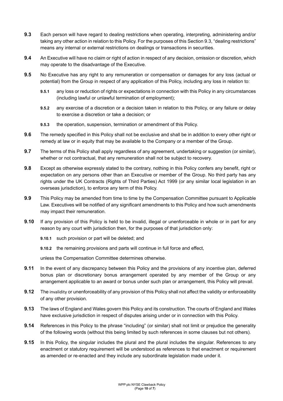 WPP plc NYSE Clawback Policy (Page 10 of 7) 9.3 Each person will have regard to dealing restrictions when operating, interpreting, administering and/or taking any other action in relation to this Policy. For the purposes of this Section 9.3, “dealing restrictions” means any internal or external restrictions on dealings or transactions in securities. 9.4 An Executive will have no claim or right of action in respect of any decision, omission or discretion, which may operate to the disadvantage of the Executive. 9.5 No Executive has any right to any remuneration or compensation or damages for any loss (actual or potential) from the Group in respect of any application of this Policy, including any loss in relation to: 9.5.1 any loss or reduction of rights or expectations in connection with this Policy in any circumstances (including lawful or unlawful termination of employment); 9.5.2 any exercise of a discretion or a decision taken in relation to this Policy, or any failure or delay to exercise a discretion or take a decision; or 9.5.3 the operation, suspension, termination or amendment of this Policy. 9.6 The remedy specified in this Policy shall not be exclusive and shall be in addition to every other right or remedy at law or in equity that may be available to the Company or a member of the Group. 9.7 The terms of this Policy shall apply regardless of any agreement, undertaking or suggestion (or similar), whether or not contractual, that any remuneration shall not be subject to recovery. 9.8 Except as otherwise expressly stated to the contrary, nothing in this Policy confers any benefit, right or expectation on any persons other than an Executive or member of the Group. No third party has any rights under the UK Contracts (Rights of Third Parties) Act 1999 (or any similar local legislation in an overseas jurisdiction), to enforce any term of this Policy. 9.9 This Policy may be amended from time to time by the Compensation Committee pursuant to Applicable Law. Executives will be notified of any significant amendments to this Policy and how such amendments may impact their remuneration. 9.10 If any provision of this Policy is held to be invalid, illegal or unenforceable in whole or in part for any reason by any court with jurisdiction then, for the purposes of that jurisdiction only: 9.10.1 such provision or part will be deleted; and 9.10.2 the remaining provisions and parts will continue in full force and effect, unless the Compensation Committee determines otherwise. 9.11 In the event of any discrepancy between this Policy and the provisions of any incentive plan, deferred bonus plan or discretionary bonus arrangement operated by any member of the Group or any arrangement applicable to an award or bonus under such plan or arrangement, this Policy will prevail. 9.12 The invalidity or unenforceability of any provision of this Policy shall not affect the validity or enforceability of any other provision. 9.13 The laws of England and Wales govern this Policy and its construction. The courts of England and Wales have exclusive jurisdiction in respect of disputes arising under or in connection with this Policy. 9.14 References in this Policy to the phrase “including” (or similar) shall not limit or prejudice the generality of the following words (without this being limited by such references in some clauses but not others). 9.15 In this Policy, the singular includes the plural and the plural includes the singular. References to any enactment or statutory requirement will be understood as references to that enactment or requirement as amended or re-enacted and they include any subordinate legislation made under it.