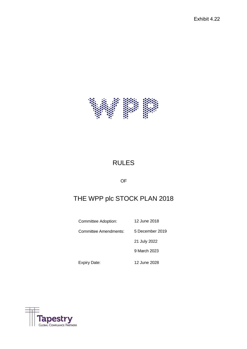 RULES OF THE WPP plc STOCK PLAN 2018 Committee Adoption: Committee Amendments: 12 June 2018 5 December 2019 21 July 2022 9 March 2023 Expiry Date: 12 June 2028 Exhibit 4.22