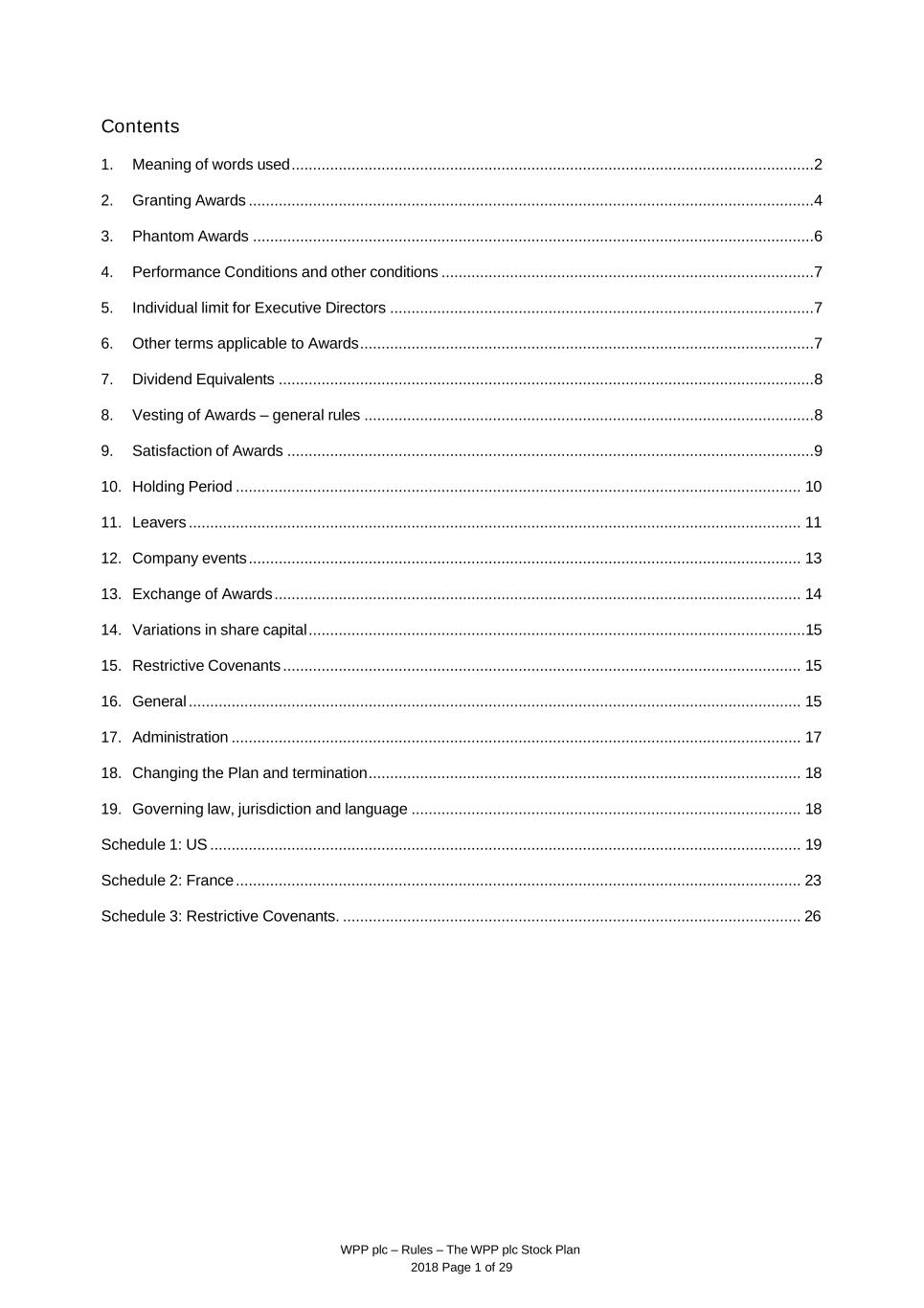 WPP plc – Rules – The WPP plc Stock Plan 2018 Page 1 of 29 Contents 1. Meaning of words used .......................................................................................................................... 2 2. Granting Awards .................................................................................................................................... 4 3. Phantom Awards ................................................................................................................................... 6 4. Performance Conditions and other conditions ....................................................................................... 7 5. Individual limit for Executive Directors ................................................................................................... 7 6. Other terms applicable to Awards .......................................................................................................... 7 7. Dividend Equivalents ............................................................................................................................. 8 8. Vesting of Awards – general rules ......................................................................................................... 8 9. Satisfaction of Awards ........................................................................................................................... 9 10. Holding Period .................................................................................................................................... 10 11. Leavers ............................................................................................................................................... 11 12. Company events ................................................................................................................................. 13 13. Exchange of Awards ........................................................................................................................... 14 14. Variations in share capital .................................................................................................................... 15 15. Restrictive Covenants ......................................................................................................................... 15 16. General ............................................................................................................................................... 15 17. Administration ..................................................................................................................................... 17 18. Changing the Plan and termination ..................................................................................................... 18 19. Governing law, jurisdiction and language ........................................................................................... 18 Schedule 1: US .......................................................................................................................................... 19 Schedule 2: France .................................................................................................................................... 23 Schedule 3: Restrictive Covenants. ........................................................................................................... 26