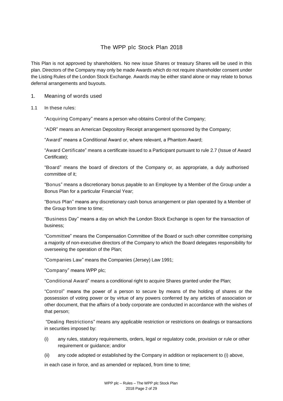 WPP plc – Rules – The WPP plc Stock Plan 2018 Page 2 of 29 The WPP plc Stock Plan 2018 This Plan is not approved by shareholders. No new issue Shares or treasury Shares will be used in this plan. Directors of the Company may only be made Awards which do not require shareholder consent under the Listing Rules of the London Stock Exchange. Awards may be either stand alone or may relate to bonus deferral arrangements and buyouts. 1. Meaning of words used 1.1 In these rules: “Acquiring Company” means a person who obtains Control of the Company; “ADR” means an American Depository Receipt arrangement sponsored by the Company; “Award” means a Conditional Award or, where relevant, a Phantom Award; “Award Certificate” means a certificate issued to a Participant pursuant to rule 2.7 (Issue of Award Certificate); “Board” means the board of directors of the Company or, as appropriate, a duly authorised committee of it; “Bonus” means a discretionary bonus payable to an Employee by a Member of the Group under a Bonus Plan for a particular Financial Year; “Bonus Plan” means any discretionary cash bonus arrangement or plan operated by a Member of the Group from time to time; “Business Day” means a day on which the London Stock Exchange is open for the transaction of business; “Committee” means the Compensation Committee of the Board or such other committee comprising a majority of non-executive directors of the Company to which the Board delegates responsibility for overseeing the operation of the Plan; “Companies Law” means the Companies (Jersey) Law 1991; “Company” means WPP plc; “Conditional Award” means a conditional right to acquire Shares granted under the Plan; “Control” means the power of a person to secure by means of the holding of shares or the possession of voting power or by virtue of any powers conferred by any articles of association or other document, that the affairs of a body corporate are conducted in accordance with the wishes of that person; “Dealing Restrictions” means any applicable restriction or restrictions on dealings or transactions in securities imposed by: (i) any rules, statutory requirements, orders, legal or regulatory code, provision or rule or other requirement or guidance; and/or (ii) any code adopted or established by the Company in addition or replacement to (i) above, in each case in force, and as amended or replaced, from time to time;