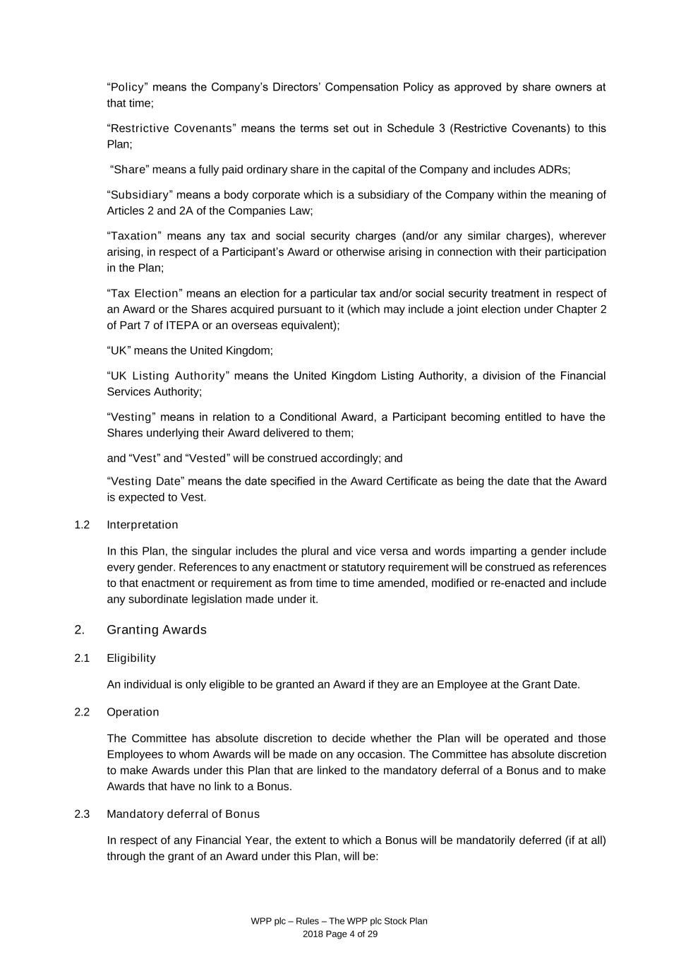 WPP plc – Rules – The WPP plc Stock Plan 2018 Page 4 of 29 “Policy” means the Company’s Directors’ Compensation Policy as approved by share owners at that time; “Restrictive Covenants” means the terms set out in Schedule 3 (Restrictive Covenants) to this Plan; “Share” means a fully paid ordinary share in the capital of the Company and includes ADRs; “Subsidiary” means a body corporate which is a subsidiary of the Company within the meaning of Articles 2 and 2A of the Companies Law; “Taxation” means any tax and social security charges (and/or any similar charges), wherever arising, in respect of a Participant’s Award or otherwise arising in connection with their participation in the Plan; “Tax Election” means an election for a particular tax and/or social security treatment in respect of an Award or the Shares acquired pursuant to it (which may include a joint election under Chapter 2 of Part 7 of ITEPA or an overseas equivalent); “UK” means the United Kingdom; “UK Listing Authority” means the United Kingdom Listing Authority, a division of the Financial Services Authority; “Vesting” means in relation to a Conditional Award, a Participant becoming entitled to have the Shares underlying their Award delivered to them; and “Vest” and “Vested” will be construed accordingly; and “Vesting Date” means the date specified in the Award Certificate as being the date that the Award is expected to Vest. 1.2 Interpretation In this Plan, the singular includes the plural and vice versa and words imparting a gender include every gender. References to any enactment or statutory requirement will be construed as references to that enactment or requirement as from time to time amended, modified or re-enacted and include any subordinate legislation made under it. 2. Granting Awards 2.1 Eligibility An individual is only eligible to be granted an Award if they are an Employee at the Grant Date. 2.2 Operation The Committee has absolute discretion to decide whether the Plan will be operated and those Employees to whom Awards will be made on any occasion. The Committee has absolute discretion to make Awards under this Plan that are linked to the mandatory deferral of a Bonus and to make Awards that have no link to a Bonus. 2.3 Mandatory deferral of Bonus In respect of any Financial Year, the extent to which a Bonus will be mandatorily deferred (if at all) through the grant of an Award under this Plan, will be: