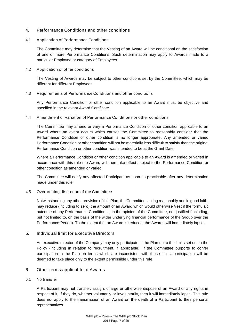 WPP plc – Rules – The WPP plc Stock Plan 2018 Page 7 of 29 4. Performance Conditions and other conditions 4.1 Application of Performance Conditions The Committee may determine that the Vesting of an Award will be conditional on the satisfaction of one or more Performance Conditions. Such determination may apply to Awards made to a particular Employee or category of Employees. 4.2 Application of other conditions The Vesting of Awards may be subject to other conditions set by the Committee, which may be different for different Employees. 4.3 Requirements of Performance Conditions and other conditions Any Performance Condition or other condition applicable to an Award must be objective and specified in the relevant Award Certificate. 4.4 Amendment or variation of Performance Conditions or other conditions The Committee may amend or vary a Performance Condition or other condition applicable to an Award where an event occurs which causes the Committee to reasonably consider that the Performance Condition or other condition is no longer appropriate. Any amended or varied Performance Condition or other condition will not be materially less difficult to satisfy than the original Performance Condition or other condition was intended to be at the Grant Date. Where a Performance Condition or other condition applicable to an Award is amended or varied in accordance with this rule the Award will then take effect subject to the Performance Condition or other condition as amended or varied. The Committee will notify any affected Participant as soon as practicable after any determination made under this rule. 4.5 Overarching discretion of the Committee Notwithstanding any other provision of this Plan, the Committee, acting reasonably and in good faith, may reduce (including to zero) the amount of an Award which would otherwise Vest if the formulaic outcome of any Performance Condition is, in the opinion of the Committee, not justified (including, but not limited to, on the basis of the wider underlying financial performance of the Group over the Performance Period). To the extent that an Award is reduced, the Awards will immediately lapse. 5. Individual limit for Executive Directors An executive director of the Company may only participate in the Plan up to the limits set out in the Policy (including in relation to recruitment, if applicable). If the Committee purports to confer participation in the Plan on terms which are inconsistent with these limits, participation will be deemed to take place only to the extent permissible under this rule. 6. Other terms applicable to Awards 6.1 No transfer A Participant may not transfer, assign, charge or otherwise dispose of an Award or any rights in respect of it. If they do, whether voluntarily or involuntarily, then it will immediately lapse. This rule does not apply to the transmission of an Award on the death of a Participant to their personal representatives.