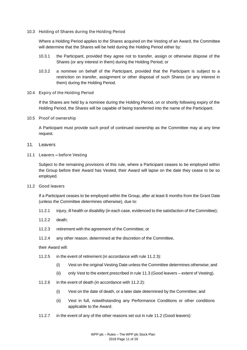 WPP plc – Rules – The WPP plc Stock Plan 2018 Page 11 of 29 10.3 Holding of Shares during the Holding Period Where a Holding Period applies to the Shares acquired on the Vesting of an Award, the Committee will determine that the Shares will be held during the Holding Period either by: 10.3.1 the Participant, provided they agree not to transfer, assign or otherwise dispose of the Shares (or any interest in them) during the Holding Period; or 10.3.2 a nominee on behalf of the Participant, provided that the Participant is subject to a restriction on transfer, assignment or other disposal of such Shares (or any interest in them) during the Holding Period. 10.4 Expiry of the Holding Period If the Shares are held by a nominee during the Holding Period, on or shortly following expiry of the Holding Period, the Shares will be capable of being transferred into the name of the Participant. 10.5 Proof of ownership A Participant must provide such proof of continued ownership as the Committee may at any time request. 11. Leavers 11.1 Leavers – before Vesting Subject to the remaining provisions of this rule, where a Participant ceases to be employed within the Group before their Award has Vested, their Award will lapse on the date they cease to be so employed. 11.2 Good leavers If a Participant ceases to be employed within the Group, after at least 6 months from the Grant Date (unless the Committee determines otherwise), due to: 11.2.1 injury, ill health or disability (in each case, evidenced to the satisfaction of the Committee); 11.2.2 death; 11.2.3 retirement with the agreement of the Committee; or 11.2.4 any other reason, determined at the discretion of the Committee, their Award will: 11.2.5 in the event of retirement (in accordance with rule 11.2.3): (i) Vest on the original Vesting Date unless the Committee determines otherwise; and (ii) only Vest to the extent prescribed in rule 11.3 (Good leavers – extent of Vesting). 11.2.6 in the event of death (in accordance with 11.2.2): (i) Vest on the date of death, or a later date determined by the Committee; and (ii) Vest in full, notwithstanding any Performance Conditions or other conditions applicable to the Award. 11.2.7 in the event of any of the other reasons set out in rule 11.2 (Good leavers):