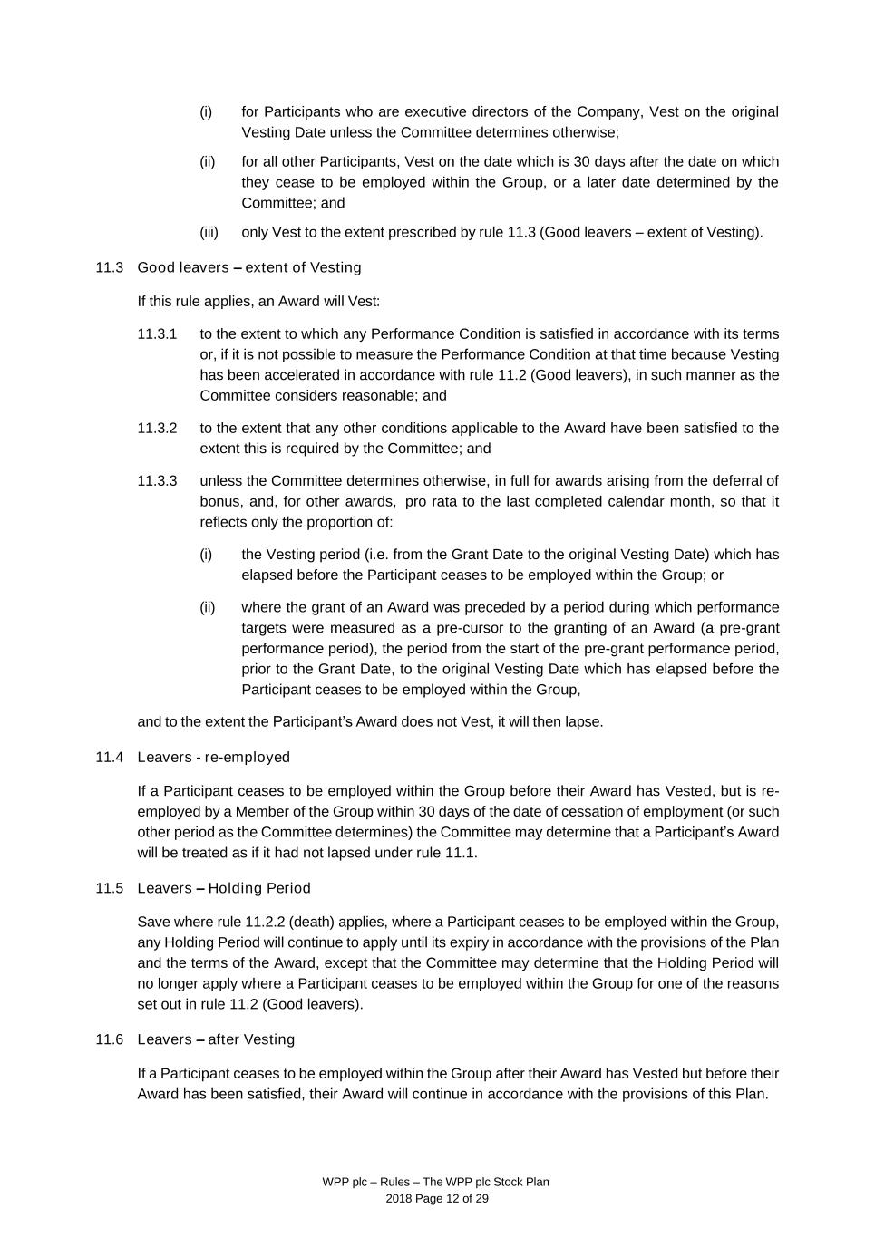 WPP plc – Rules – The WPP plc Stock Plan 2018 Page 12 of 29 (i) for Participants who are executive directors of the Company, Vest on the original Vesting Date unless the Committee determines otherwise; (ii) for all other Participants, Vest on the date which is 30 days after the date on which they cease to be employed within the Group, or a later date determined by the Committee; and (iii) only Vest to the extent prescribed by rule 11.3 (Good leavers – extent of Vesting). 11.3 Good leavers – extent of Vesting If this rule applies, an Award will Vest: 11.3.1 to the extent to which any Performance Condition is satisfied in accordance with its terms or, if it is not possible to measure the Performance Condition at that time because Vesting has been accelerated in accordance with rule 11.2 (Good leavers), in such manner as the Committee considers reasonable; and 11.3.2 to the extent that any other conditions applicable to the Award have been satisfied to the extent this is required by the Committee; and 11.3.3 unless the Committee determines otherwise, in full for awards arising from the deferral of bonus, and, for other awards, pro rata to the last completed calendar month, so that it reflects only the proportion of: (i) the Vesting period (i.e. from the Grant Date to the original Vesting Date) which has elapsed before the Participant ceases to be employed within the Group; or (ii) where the grant of an Award was preceded by a period during which performance targets were measured as a pre-cursor to the granting of an Award (a pre-grant performance period), the period from the start of the pre-grant performance period, prior to the Grant Date, to the original Vesting Date which has elapsed before the Participant ceases to be employed within the Group, and to the extent the Participant’s Award does not Vest, it will then lapse. 11.4 Leavers - re-employed If a Participant ceases to be employed within the Group before their Award has Vested, but is re- employed by a Member of the Group within 30 days of the date of cessation of employment (or such other period as the Committee determines) the Committee may determine that a Participant’s Award will be treated as if it had not lapsed under rule 11.1. 11.5 Leavers – Holding Period Save where rule 11.2.2 (death) applies, where a Participant ceases to be employed within the Group, any Holding Period will continue to apply until its expiry in accordance with the provisions of the Plan and the terms of the Award, except that the Committee may determine that the Holding Period will no longer apply where a Participant ceases to be employed within the Group for one of the reasons set out in rule 11.2 (Good leavers). 11.6 Leavers – after Vesting If a Participant ceases to be employed within the Group after their Award has Vested but before their Award has been satisfied, their Award will continue in accordance with the provisions of this Plan.