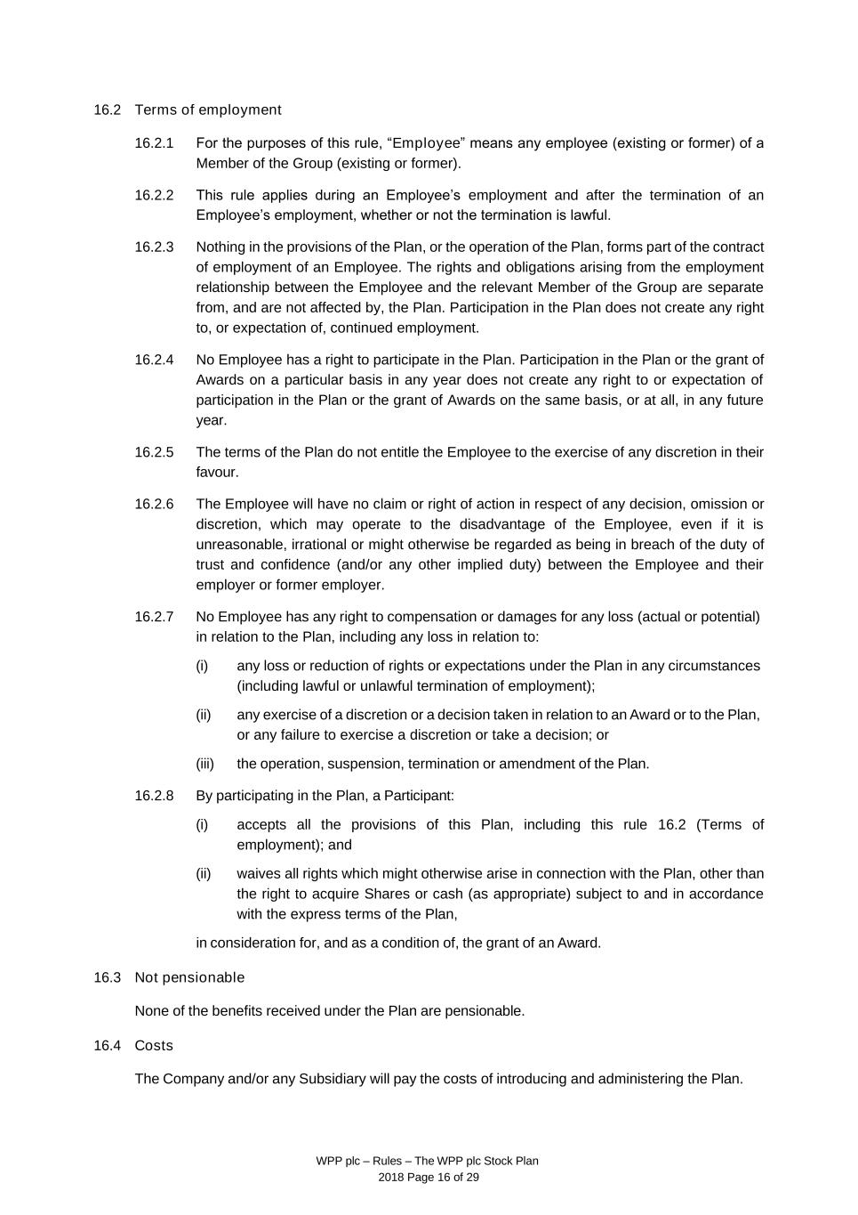 WPP plc – Rules – The WPP plc Stock Plan 2018 Page 16 of 29 16.2 Terms of employment 16.2.1 For the purposes of this rule, “Employee” means any employee (existing or former) of a Member of the Group (existing or former). 16.2.2 This rule applies during an Employee’s employment and after the termination of an Employee’s employment, whether or not the termination is lawful. 16.2.3 Nothing in the provisions of the Plan, or the operation of the Plan, forms part of the contract of employment of an Employee. The rights and obligations arising from the employment relationship between the Employee and the relevant Member of the Group are separate from, and are not affected by, the Plan. Participation in the Plan does not create any right to, or expectation of, continued employment. 16.2.4 No Employee has a right to participate in the Plan. Participation in the Plan or the grant of Awards on a particular basis in any year does not create any right to or expectation of participation in the Plan or the grant of Awards on the same basis, or at all, in any future year. 16.2.5 The terms of the Plan do not entitle the Employee to the exercise of any discretion in their favour. 16.2.6 The Employee will have no claim or right of action in respect of any decision, omission or discretion, which may operate to the disadvantage of the Employee, even if it is unreasonable, irrational or might otherwise be regarded as being in breach of the duty of trust and confidence (and/or any other implied duty) between the Employee and their employer or former employer. 16.2.7 No Employee has any right to compensation or damages for any loss (actual or potential) in relation to the Plan, including any loss in relation to: (i) any loss or reduction of rights or expectations under the Plan in any circumstances (including lawful or unlawful termination of employment); (ii) any exercise of a discretion or a decision taken in relation to an Award or to the Plan, or any failure to exercise a discretion or take a decision; or (iii) the operation, suspension, termination or amendment of the Plan. 16.2.8 By participating in the Plan, a Participant: (i) accepts all the provisions of this Plan, including this rule 16.2 (Terms of employment); and (ii) waives all rights which might otherwise arise in connection with the Plan, other than the right to acquire Shares or cash (as appropriate) subject to and in accordance with the express terms of the Plan, in consideration for, and as a condition of, the grant of an Award. 16.3 Not pensionable None of the benefits received under the Plan are pensionable. 16.4 Costs The Company and/or any Subsidiary will pay the costs of introducing and administering the Plan.