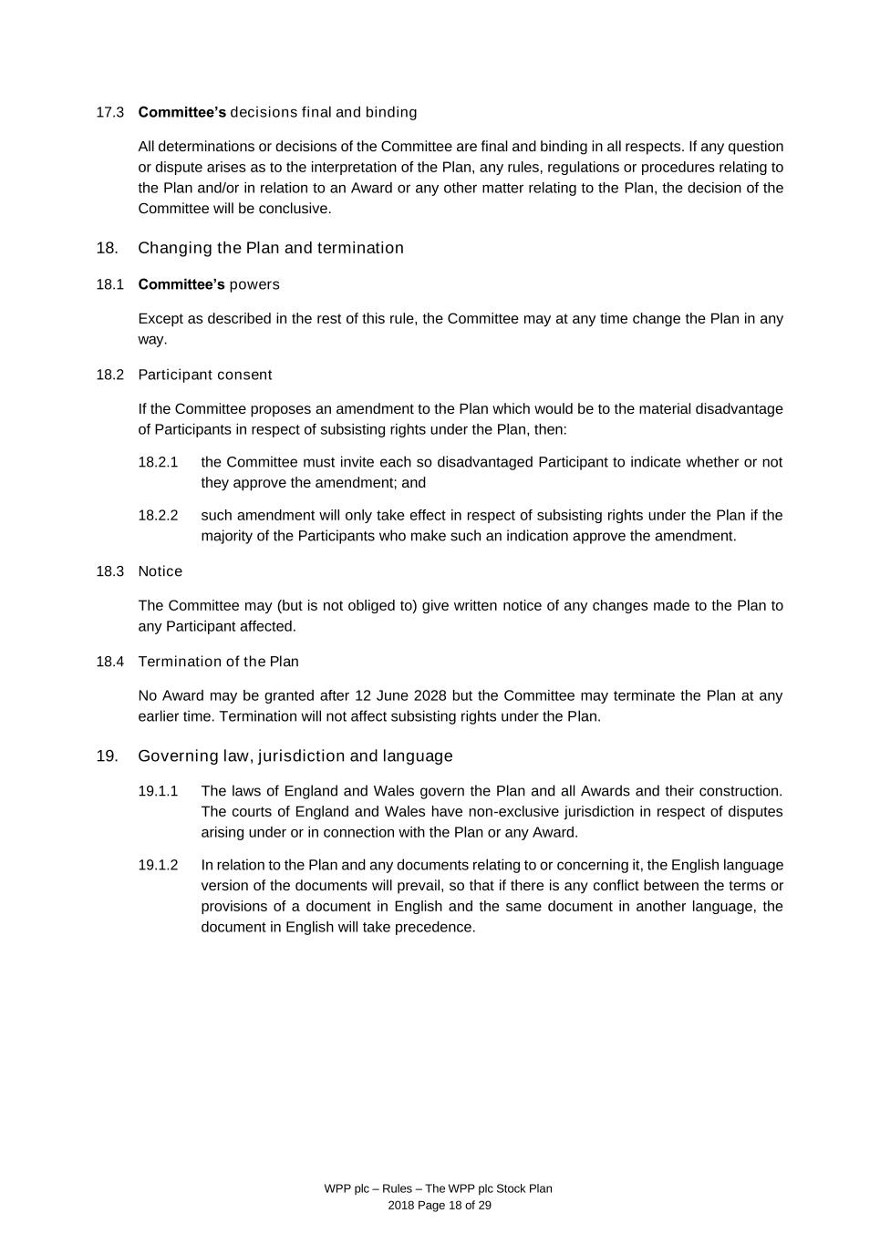 WPP plc – Rules – The WPP plc Stock Plan 2018 Page 18 of 29 17.3 Committee’s decisions final and binding All determinations or decisions of the Committee are final and binding in all respects. If any question or dispute arises as to the interpretation of the Plan, any rules, regulations or procedures relating to the Plan and/or in relation to an Award or any other matter relating to the Plan, the decision of the Committee will be conclusive. 18. Changing the Plan and termination 18.1 Committee’s powers Except as described in the rest of this rule, the Committee may at any time change the Plan in any way. 18.2 Participant consent If the Committee proposes an amendment to the Plan which would be to the material disadvantage of Participants in respect of subsisting rights under the Plan, then: 18.2.1 the Committee must invite each so disadvantaged Participant to indicate whether or not they approve the amendment; and 18.2.2 such amendment will only take effect in respect of subsisting rights under the Plan if the majority of the Participants who make such an indication approve the amendment. 18.3 Notice The Committee may (but is not obliged to) give written notice of any changes made to the Plan to any Participant affected. 18.4 Termination of the Plan No Award may be granted after 12 June 2028 but the Committee may terminate the Plan at any earlier time. Termination will not affect subsisting rights under the Plan. 19. Governing law, jurisdiction and language 19.1.1 The laws of England and Wales govern the Plan and all Awards and their construction. The courts of England and Wales have non-exclusive jurisdiction in respect of disputes arising under or in connection with the Plan or any Award. 19.1.2 In relation to the Plan and any documents relating to or concerning it, the English language version of the documents will prevail, so that if there is any conflict between the terms or provisions of a document in English and the same document in another language, the document in English will take precedence.
