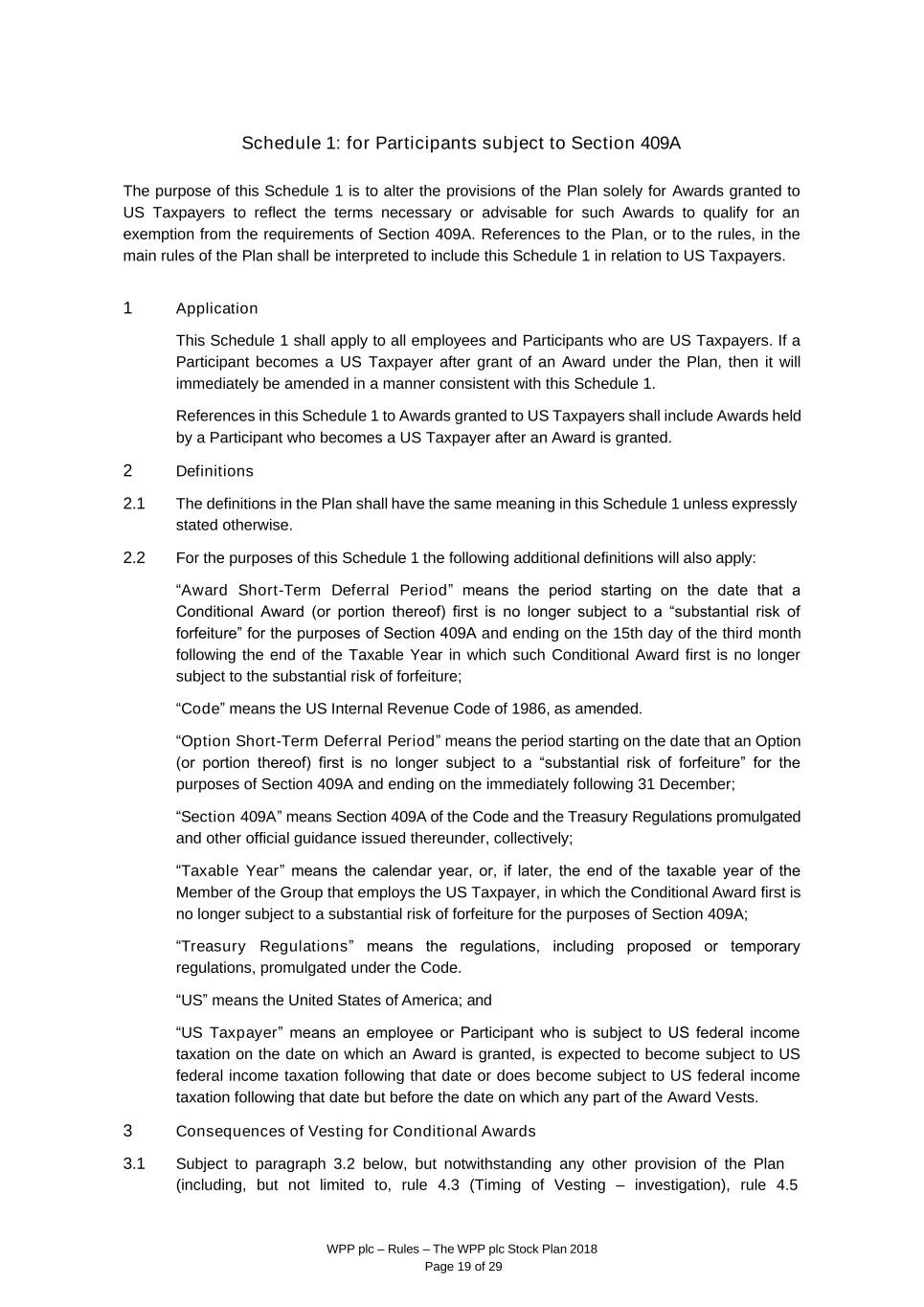 WPP plc – Rules – The WPP plc Stock Plan 2018 Page 19 of 29 Schedule 1: for Participants subject to Section 409A The purpose of this Schedule 1 is to alter the provisions of the Plan solely for Awards granted to US Taxpayers to reflect the terms necessary or advisable for such Awards to qualify for an exemption from the requirements of Section 409A. References to the Plan, or to the rules, in the main rules of the Plan shall be interpreted to include this Schedule 1 in relation to US Taxpayers. 1 Application This Schedule 1 shall apply to all employees and Participants who are US Taxpayers. If a Participant becomes a US Taxpayer after grant of an Award under the Plan, then it will immediately be amended in a manner consistent with this Schedule 1. References in this Schedule 1 to Awards granted to US Taxpayers shall include Awards held by a Participant who becomes a US Taxpayer after an Award is granted. 2 Definitions 2.1 The definitions in the Plan shall have the same meaning in this Schedule 1 unless expressly stated otherwise. 2.2 For the purposes of this Schedule 1 the following additional definitions will also apply: “Award Short-Term Deferral Period” means the period starting on the date that a Conditional Award (or portion thereof) first is no longer subject to a “substantial risk of forfeiture” for the purposes of Section 409A and ending on the 15th day of the third month following the end of the Taxable Year in which such Conditional Award first is no longer subject to the substantial risk of forfeiture; “Code” means the US Internal Revenue Code of 1986, as amended. “Option Short-Term Deferral Period” means the period starting on the date that an Option (or portion thereof) first is no longer subject to a “substantial risk of forfeiture” for the purposes of Section 409A and ending on the immediately following 31 December; “Section 409A” means Section 409A of the Code and the Treasury Regulations promulgated and other official guidance issued thereunder, collectively; “Taxable Year” means the calendar year, or, if later, the end of the taxable year of the Member of the Group that employs the US Taxpayer, in which the Conditional Award first is no longer subject to a substantial risk of forfeiture for the purposes of Section 409A; “Treasury Regulations” means the regulations, including proposed or temporary regulations, promulgated under the Code. “US” means the United States of America; and “US Taxpayer” means an employee or Participant who is subject to US federal income taxation on the date on which an Award is granted, is expected to become subject to US federal income taxation following that date or does become subject to US federal income taxation following that date but before the date on which any part of the Award Vests. 3 Consequences of Vesting for Conditional Awards 3.1 Subject to paragraph 3.2 below, but notwithstanding any other provision of the Plan (including, but not limited to, rule 4.3 (Timing of Vesting – investigation), rule 4.5