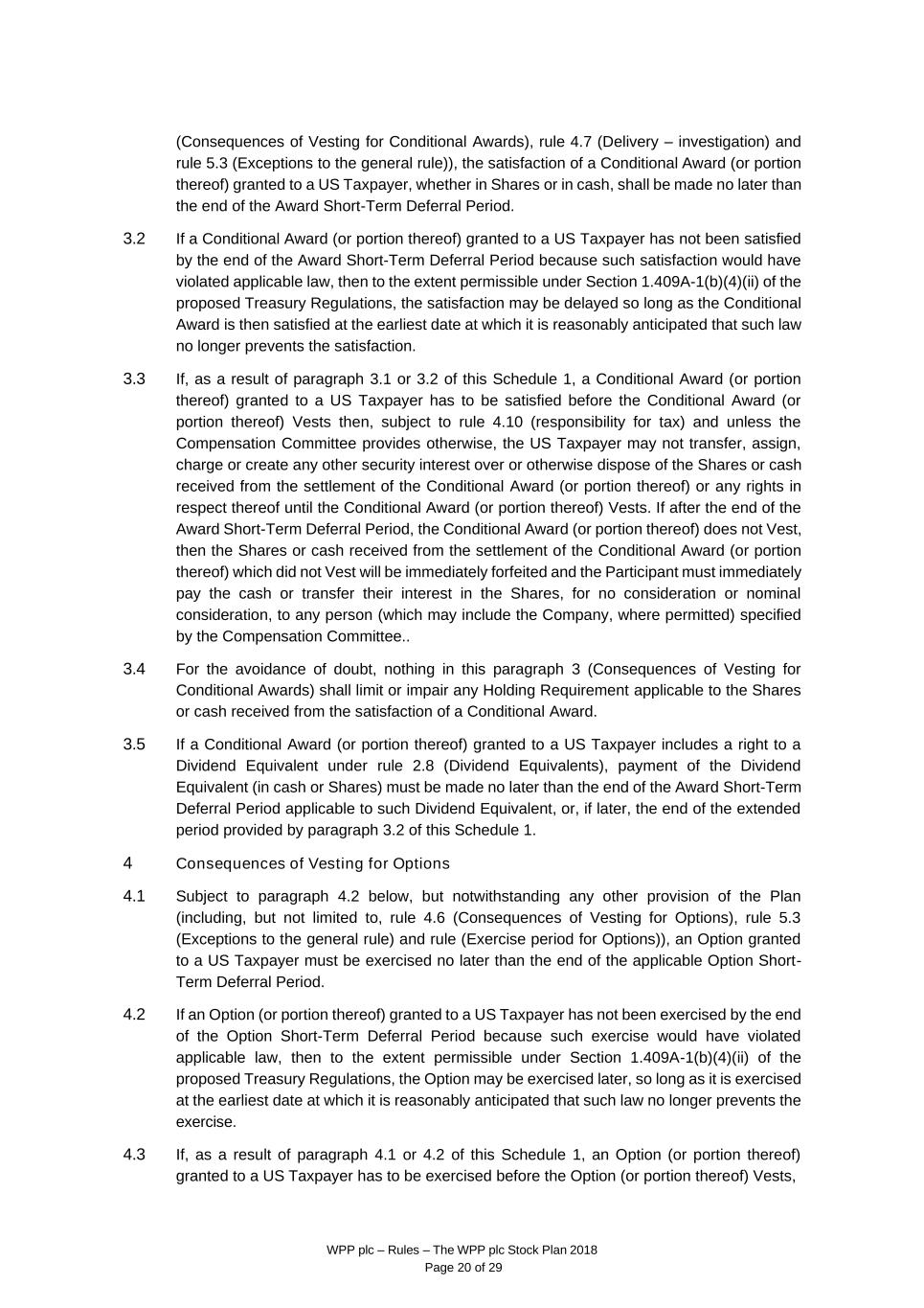 WPP plc – Rules – The WPP plc Stock Plan 2018 Page 20 of 29 (Consequences of Vesting for Conditional Awards), rule 4.7 (Delivery – investigation) and rule 5.3 (Exceptions to the general rule)), the satisfaction of a Conditional Award (or portion thereof) granted to a US Taxpayer, whether in Shares or in cash, shall be made no later than the end of the Award Short-Term Deferral Period. 3.2 If a Conditional Award (or portion thereof) granted to a US Taxpayer has not been satisfied by the end of the Award Short-Term Deferral Period because such satisfaction would have violated applicable law, then to the extent permissible under Section 1.409A-1(b)(4)(ii) of the proposed Treasury Regulations, the satisfaction may be delayed so long as the Conditional Award is then satisfied at the earliest date at which it is reasonably anticipated that such law no longer prevents the satisfaction. 3.3 If, as a result of paragraph 3.1 or 3.2 of this Schedule 1, a Conditional Award (or portion thereof) granted to a US Taxpayer has to be satisfied before the Conditional Award (or portion thereof) Vests then, subject to rule 4.10 (responsibility for tax) and unless the Compensation Committee provides otherwise, the US Taxpayer may not transfer, assign, charge or create any other security interest over or otherwise dispose of the Shares or cash received from the settlement of the Conditional Award (or portion thereof) or any rights in respect thereof until the Conditional Award (or portion thereof) Vests. If after the end of the Award Short-Term Deferral Period, the Conditional Award (or portion thereof) does not Vest, then the Shares or cash received from the settlement of the Conditional Award (or portion thereof) which did not Vest will be immediately forfeited and the Participant must immediately pay the cash or transfer their interest in the Shares, for no consideration or nominal consideration, to any person (which may include the Company, where permitted) specified by the Compensation Committee.. 3.4 For the avoidance of doubt, nothing in this paragraph 3 (Consequences of Vesting for Conditional Awards) shall limit or impair any Holding Requirement applicable to the Shares or cash received from the satisfaction of a Conditional Award. 3.5 If a Conditional Award (or portion thereof) granted to a US Taxpayer includes a right to a Dividend Equivalent under rule 2.8 (Dividend Equivalents), payment of the Dividend Equivalent (in cash or Shares) must be made no later than the end of the Award Short-Term Deferral Period applicable to such Dividend Equivalent, or, if later, the end of the extended period provided by paragraph 3.2 of this Schedule 1. 4 Consequences of Vesting for Options 4.1 Subject to paragraph 4.2 below, but notwithstanding any other provision of the Plan (including, but not limited to, rule 4.6 (Consequences of Vesting for Options), rule 5.3 (Exceptions to the general rule) and rule (Exercise period for Options)), an Option granted to a US Taxpayer must be exercised no later than the end of the applicable Option Short- Term Deferral Period. 4.2 If an Option (or portion thereof) granted to a US Taxpayer has not been exercised by the end of the Option Short-Term Deferral Period because such exercise would have violated applicable law, then to the extent permissible under Section 1.409A-1(b)(4)(ii) of the proposed Treasury Regulations, the Option may be exercised later, so long as it is exercised at the earliest date at which it is reasonably anticipated that such law no longer prevents the exercise. 4.3 If, as a result of paragraph 4.1 or 4.2 of this Schedule 1, an Option (or portion thereof) granted to a US Taxpayer has to be exercised before the Option (or portion thereof) Vests,