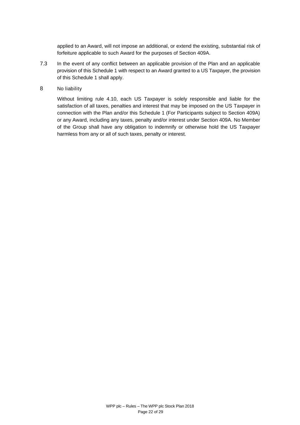 WPP plc – Rules – The WPP plc Stock Plan 2018 Page 22 of 29 applied to an Award, will not impose an additional, or extend the existing, substantial risk of forfeiture applicable to such Award for the purposes of Section 409A. 7.3 In the event of any conflict between an applicable provision of the Plan and an applicable provision of this Schedule 1 with respect to an Award granted to a US Taxpayer, the provision of this Schedule 1 shall apply. 8 No liability Without limiting rule 4.10, each US Taxpayer is solely responsible and liable for the satisfaction of all taxes, penalties and interest that may be imposed on the US Taxpayer in connection with the Plan and/or this Schedule 1 (For Participants subject to Section 409A) or any Award, including any taxes, penalty and/or interest under Section 409A. No Member of the Group shall have any obligation to indemnify or otherwise hold the US Taxpayer harmless from any or all of such taxes, penalty or interest.