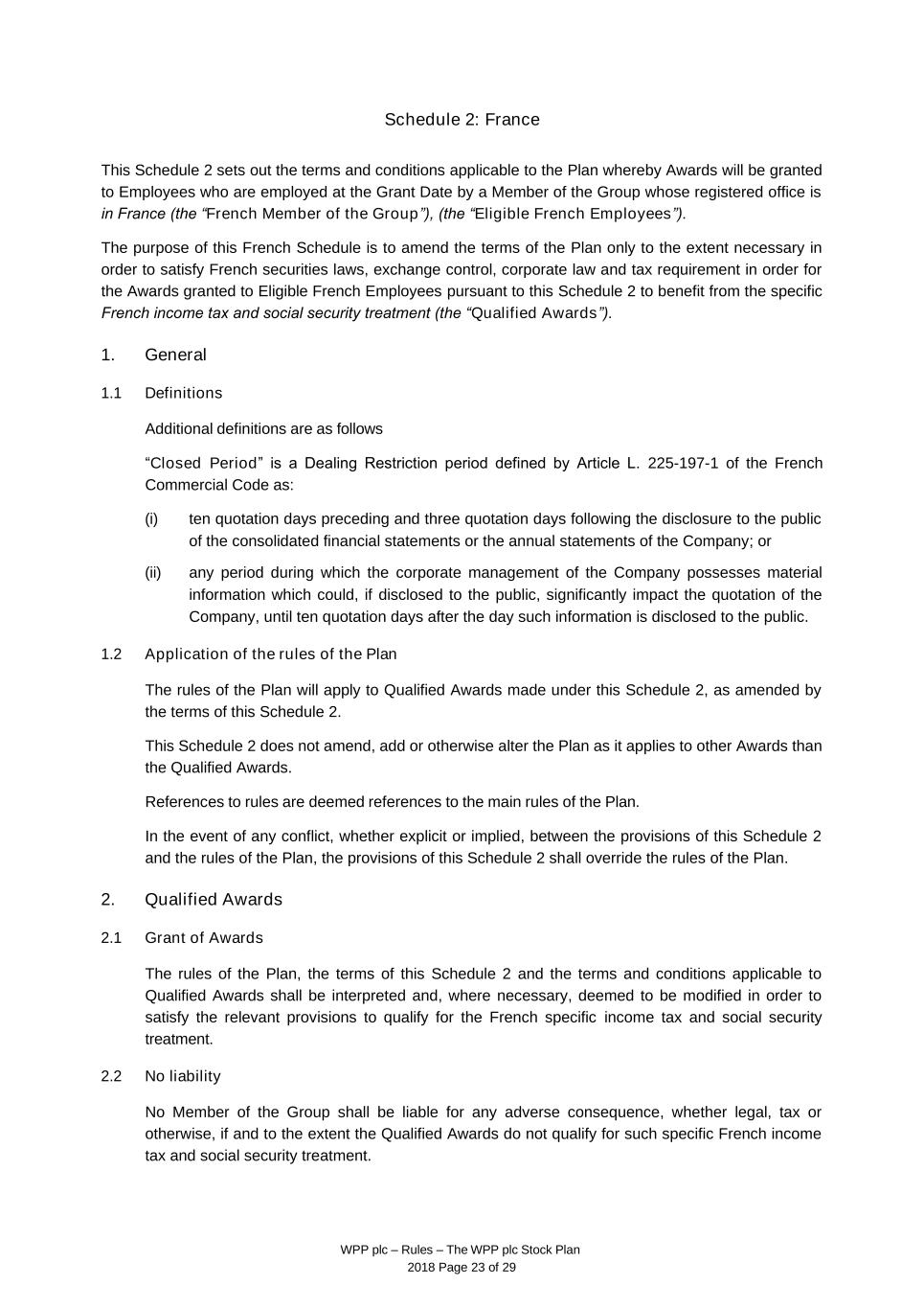WPP plc – Rules – The WPP plc Stock Plan 2018 Page 23 of 29 Schedule 2: France This Schedule 2 sets out the terms and conditions applicable to the Plan whereby Awards will be granted to Employees who are employed at the Grant Date by a Member of the Group whose registered office is in France (the “French Member of the Group”), (the “Eligible French Employees”). The purpose of this French Schedule is to amend the terms of the Plan only to the extent necessary in order to satisfy French securities laws, exchange control, corporate law and tax requirement in order for the Awards granted to Eligible French Employees pursuant to this Schedule 2 to benefit from the specific French income tax and social security treatment (the “Qualified Awards”). 1. General 1.1 Definitions Additional definitions are as follows “Closed Period” is a Dealing Restriction period defined by Article L. 225-197-1 of the French Commercial Code as: (i) ten quotation days preceding and three quotation days following the disclosure to the public of the consolidated financial statements or the annual statements of the Company; or (ii) any period during which the corporate management of the Company possesses material information which could, if disclosed to the public, significantly impact the quotation of the Company, until ten quotation days after the day such information is disclosed to the public. 1.2 Application of the rules of the Plan The rules of the Plan will apply to Qualified Awards made under this Schedule 2, as amended by the terms of this Schedule 2. This Schedule 2 does not amend, add or otherwise alter the Plan as it applies to other Awards than the Qualified Awards. References to rules are deemed references to the main rules of the Plan. In the event of any conflict, whether explicit or implied, between the provisions of this Schedule 2 and the rules of the Plan, the provisions of this Schedule 2 shall override the rules of the Plan. 2. Qualified Awards 2.1 Grant of Awards The rules of the Plan, the terms of this Schedule 2 and the terms and conditions applicable to Qualified Awards shall be interpreted and, where necessary, deemed to be modified in order to satisfy the relevant provisions to qualify for the French specific income tax and social security treatment. 2.2 No liability No Member of the Group shall be liable for any adverse consequence, whether legal, tax or otherwise, if and to the extent the Qualified Awards do not qualify for such specific French income tax and social security treatment.