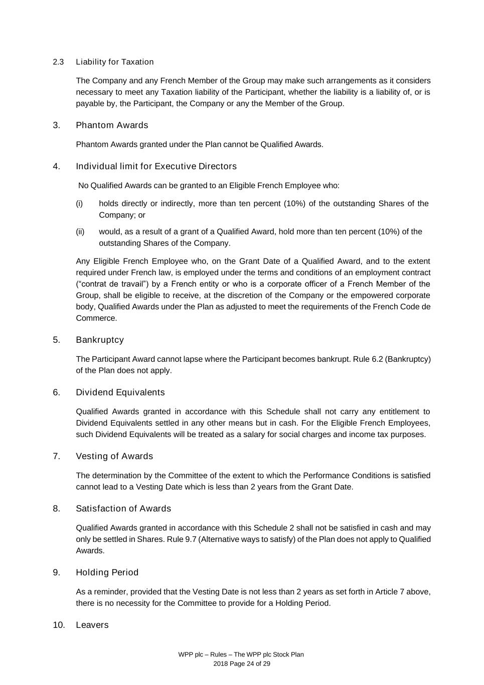 WPP plc – Rules – The WPP plc Stock Plan 2018 Page 24 of 29 2.3 Liability for Taxation The Company and any French Member of the Group may make such arrangements as it considers necessary to meet any Taxation liability of the Participant, whether the liability is a liability of, or is payable by, the Participant, the Company or any the Member of the Group. 3. Phantom Awards Phantom Awards granted under the Plan cannot be Qualified Awards. 4. Individual limit for Executive Directors No Qualified Awards can be granted to an Eligible French Employee who: (i) holds directly or indirectly, more than ten percent (10%) of the outstanding Shares of the Company; or (ii) would, as a result of a grant of a Qualified Award, hold more than ten percent (10%) of the outstanding Shares of the Company. Any Eligible French Employee who, on the Grant Date of a Qualified Award, and to the extent required under French law, is employed under the terms and conditions of an employment contract (“contrat de travail”) by a French entity or who is a corporate officer of a French Member of the Group, shall be eligible to receive, at the discretion of the Company or the empowered corporate body, Qualified Awards under the Plan as adjusted to meet the requirements of the French Code de Commerce. 5. Bankruptcy The Participant Award cannot lapse where the Participant becomes bankrupt. Rule 6.2 (Bankruptcy) of the Plan does not apply. 6. Dividend Equivalents Qualified Awards granted in accordance with this Schedule shall not carry any entitlement to Dividend Equivalents settled in any other means but in cash. For the Eligible French Employees, such Dividend Equivalents will be treated as a salary for social charges and income tax purposes. 7. Vesting of Awards The determination by the Committee of the extent to which the Performance Conditions is satisfied cannot lead to a Vesting Date which is less than 2 years from the Grant Date. 8. Satisfaction of Awards Qualified Awards granted in accordance with this Schedule 2 shall not be satisfied in cash and may only be settled in Shares. Rule 9.7 (Alternative ways to satisfy) of the Plan does not apply to Qualified Awards. 9. Holding Period As a reminder, provided that the Vesting Date is not less than 2 years as set forth in Article 7 above, there is no necessity for the Committee to provide for a Holding Period. 10. Leavers