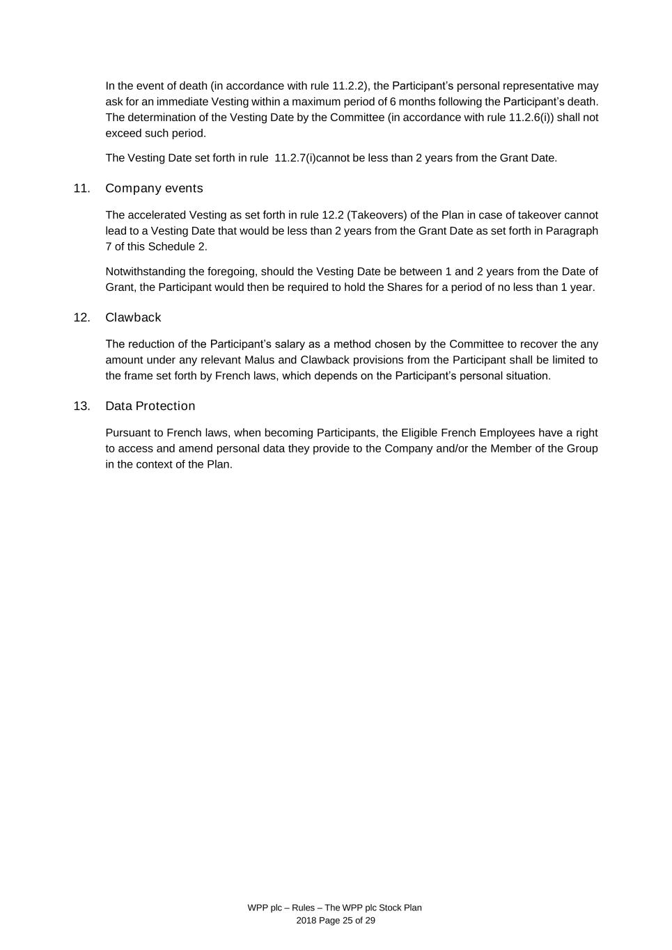 WPP plc – Rules – The WPP plc Stock Plan 2018 Page 25 of 29 In the event of death (in accordance with rule 11.2.2), the Participant’s personal representative may ask for an immediate Vesting within a maximum period of 6 months following the Participant’s death. The determination of the Vesting Date by the Committee (in accordance with rule 11.2.6(i)) shall not exceed such period. The Vesting Date set forth in rule 11.2.7(i)cannot be less than 2 years from the Grant Date. 11. Company events The accelerated Vesting as set forth in rule 12.2 (Takeovers) of the Plan in case of takeover cannot lead to a Vesting Date that would be less than 2 years from the Grant Date as set forth in Paragraph 7 of this Schedule 2. Notwithstanding the foregoing, should the Vesting Date be between 1 and 2 years from the Date of Grant, the Participant would then be required to hold the Shares for a period of no less than 1 year. 12. Clawback The reduction of the Participant’s salary as a method chosen by the Committee to recover the any amount under any relevant Malus and Clawback provisions from the Participant shall be limited to the frame set forth by French laws, which depends on the Participant’s personal situation. 13. Data Protection Pursuant to French laws, when becoming Participants, the Eligible French Employees have a right to access and amend personal data they provide to the Company and/or the Member of the Group in the context of the Plan.