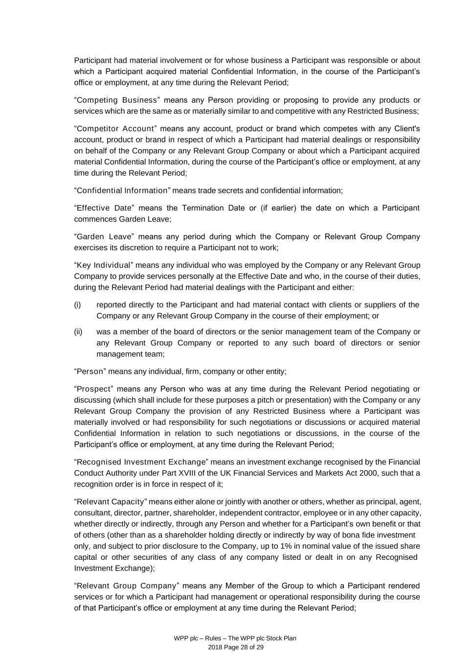WPP plc – Rules – The WPP plc Stock Plan 2018 Page 28 of 29 Participant had material involvement or for whose business a Participant was responsible or about which a Participant acquired material Confidential Information, in the course of the Participant’s office or employment, at any time during the Relevant Period; “Competing Business” means any Person providing or proposing to provide any products or services which are the same as or materially similar to and competitive with any Restricted Business; “Competitor Account” means any account, product or brand which competes with any Client's account, product or brand in respect of which a Participant had material dealings or responsibility on behalf of the Company or any Relevant Group Company or about which a Participant acquired material Confidential Information, during the course of the Participant’s office or employment, at any time during the Relevant Period; “Confidential Information” means trade secrets and confidential information; “Effective Date” means the Termination Date or (if earlier) the date on which a Participant commences Garden Leave; “Garden Leave” means any period during which the Company or Relevant Group Company exercises its discretion to require a Participant not to work; “Key Individual” means any individual who was employed by the Company or any Relevant Group Company to provide services personally at the Effective Date and who, in the course of their duties, during the Relevant Period had material dealings with the Participant and either: (i) reported directly to the Participant and had material contact with clients or suppliers of the Company or any Relevant Group Company in the course of their employment; or (ii) was a member of the board of directors or the senior management team of the Company or any Relevant Group Company or reported to any such board of directors or senior management team; “Person” means any individual, firm, company or other entity; “Prospect” means any Person who was at any time during the Relevant Period negotiating or discussing (which shall include for these purposes a pitch or presentation) with the Company or any Relevant Group Company the provision of any Restricted Business where a Participant was materially involved or had responsibility for such negotiations or discussions or acquired material Confidential Information in relation to such negotiations or discussions, in the course of the Participant’s office or employment, at any time during the Relevant Period; “Recognised Investment Exchange” means an investment exchange recognised by the Financial Conduct Authority under Part XVIII of the UK Financial Services and Markets Act 2000, such that a recognition order is in force in respect of it; “Relevant Capacity” means either alone or jointly with another or others, whether as principal, agent, consultant, director, partner, shareholder, independent contractor, employee or in any other capacity, whether directly or indirectly, through any Person and whether for a Participant’s own benefit or that of others (other than as a shareholder holding directly or indirectly by way of bona fide investment only, and subject to prior disclosure to the Company, up to 1% in nominal value of the issued share capital or other securities of any class of any company listed or dealt in on any Recognised Investment Exchange); “Relevant Group Company” means any Member of the Group to which a Participant rendered services or for which a Participant had management or operational responsibility during the course of that Participant’s office or employment at any time during the Relevant Period;