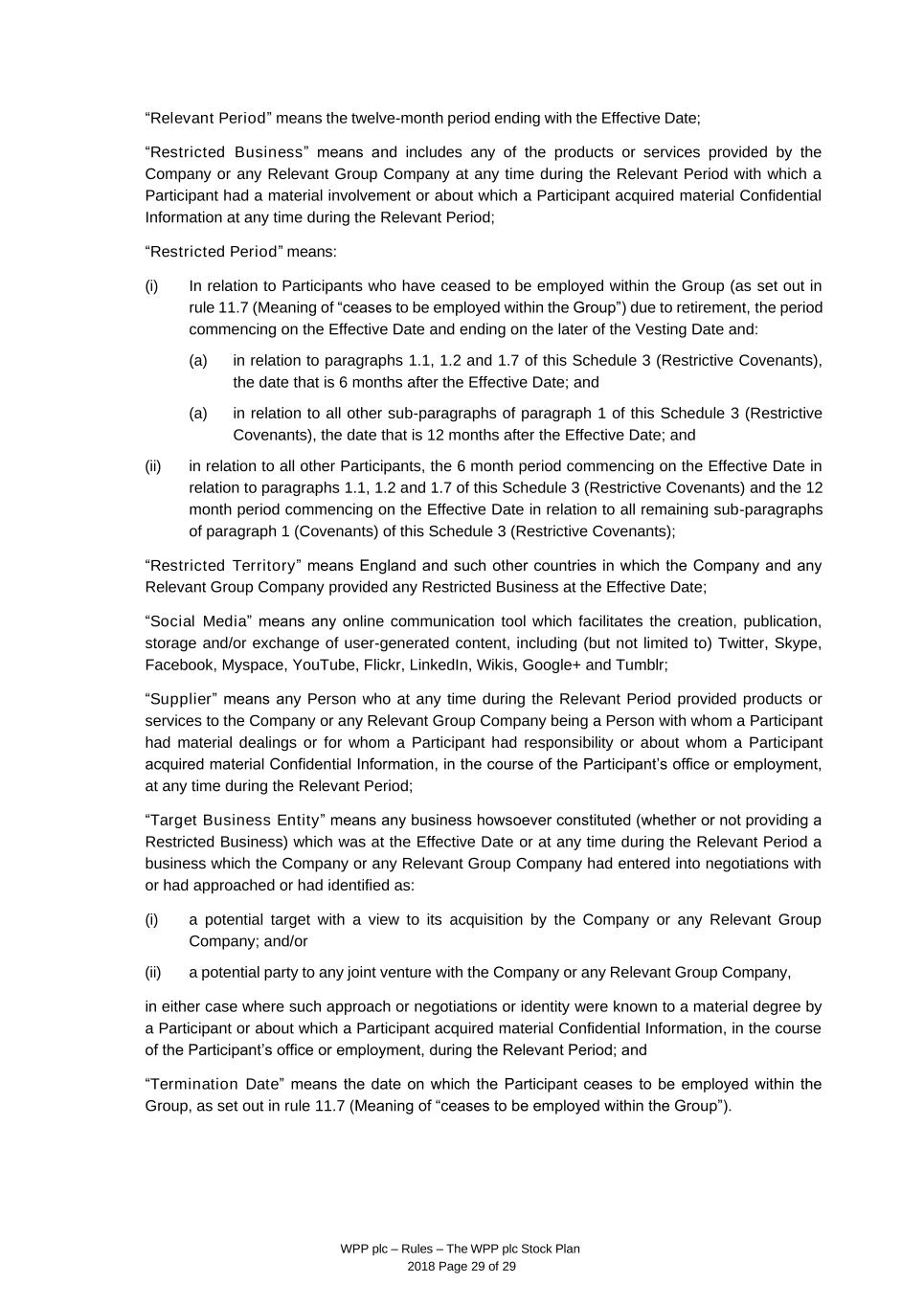 WPP plc – Rules – The WPP plc Stock Plan 2018 Page 29 of 29 “Relevant Period” means the twelve-month period ending with the Effective Date; “Restricted Business” means and includes any of the products or services provided by the Company or any Relevant Group Company at any time during the Relevant Period with which a Participant had a material involvement or about which a Participant acquired material Confidential Information at any time during the Relevant Period; “Restricted Period” means: (i) In relation to Participants who have ceased to be employed within the Group (as set out in rule 11.7 (Meaning of “ceases to be employed within the Group”) due to retirement, the period commencing on the Effective Date and ending on the later of the Vesting Date and: (a) in relation to paragraphs 1.1, 1.2 and 1.7 of this Schedule 3 (Restrictive Covenants), the date that is 6 months after the Effective Date; and (a) in relation to all other sub-paragraphs of paragraph 1 of this Schedule 3 (Restrictive Covenants), the date that is 12 months after the Effective Date; and (ii) in relation to all other Participants, the 6 month period commencing on the Effective Date in relation to paragraphs 1.1, 1.2 and 1.7 of this Schedule 3 (Restrictive Covenants) and the 12 month period commencing on the Effective Date in relation to all remaining sub-paragraphs of paragraph 1 (Covenants) of this Schedule 3 (Restrictive Covenants); “Restricted Territory” means England and such other countries in which the Company and any Relevant Group Company provided any Restricted Business at the Effective Date; “Social Media” means any online communication tool which facilitates the creation, publication, storage and/or exchange of user-generated content, including (but not limited to) Twitter, Skype, Facebook, Myspace, YouTube, Flickr, LinkedIn, Wikis, Google+ and Tumblr; “Supplier” means any Person who at any time during the Relevant Period provided products or services to the Company or any Relevant Group Company being a Person with whom a Participant had material dealings or for whom a Participant had responsibility or about whom a Participant acquired material Confidential Information, in the course of the Participant’s office or employment, at any time during the Relevant Period; “Target Business Entity” means any business howsoever constituted (whether or not providing a Restricted Business) which was at the Effective Date or at any time during the Relevant Period a business which the Company or any Relevant Group Company had entered into negotiations with or had approached or had identified as: (i) a potential target with a view to its acquisition by the Company or any Relevant Group Company; and/or (ii) a potential party to any joint venture with the Company or any Relevant Group Company, in either case where such approach or negotiations or identity were known to a material degree by a Participant or about which a Participant acquired material Confidential Information, in the course of the Participant’s office or employment, during the Relevant Period; and “Termination Date” means the date on which the Participant ceases to be employed within the Group, as set out in rule 11.7 (Meaning of “ceases to be employed within the Group”).
