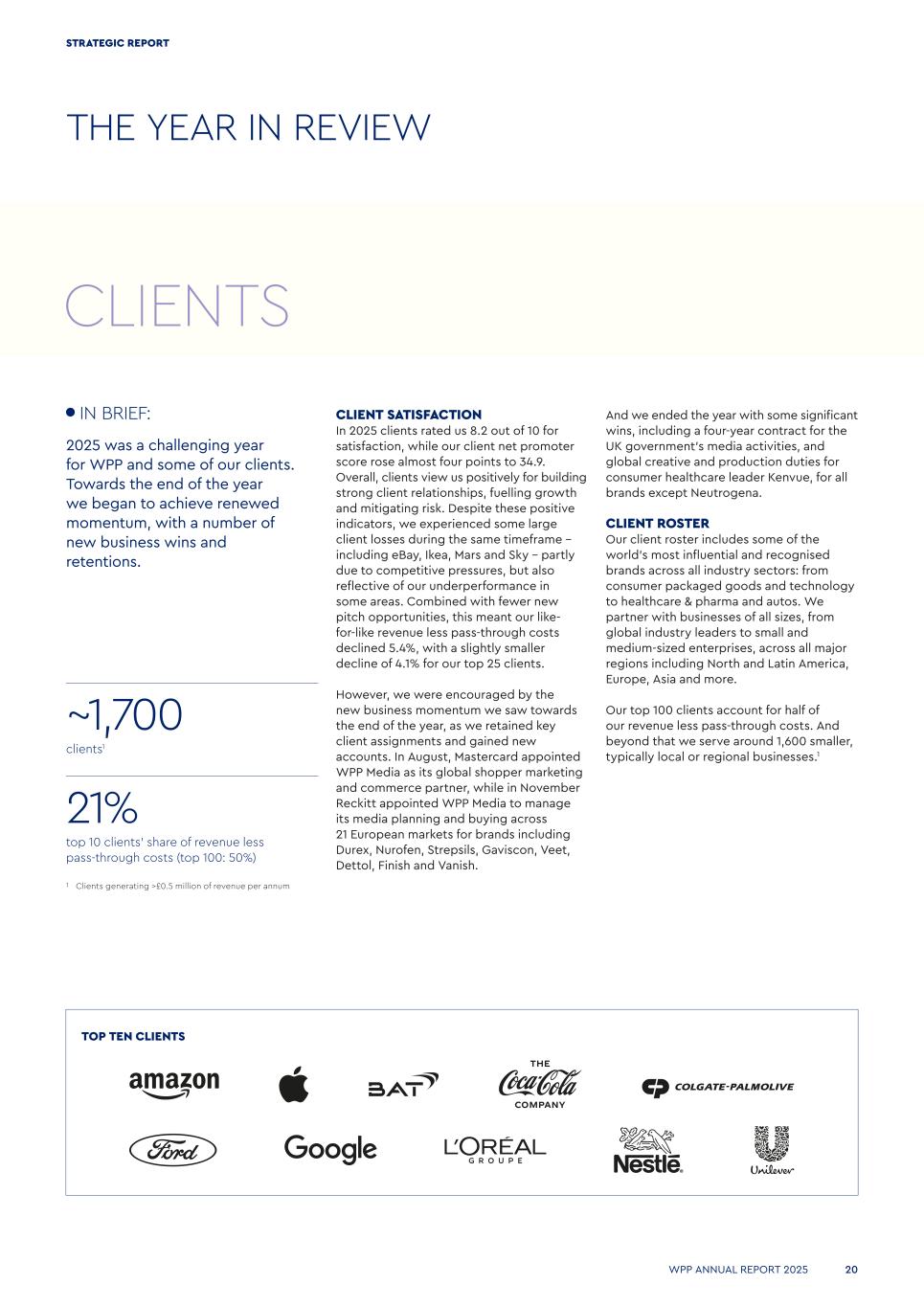 THE YEAR IN REVIEW CLIENT SATISFACTION In 2025 clients rated us 8.2 out of 10 for satisfaction, while our client net promoter score rose almost four points to 34.9. Overall, clients view us positively for building strong client relationships, fuelling growth and mitigating risk. Despite these positive indicators, we experienced some large client losses during the same timeframe - including eBay, Ikea, Mars and Sky - partly due to competitive pressures, but also reflective of our underperformance in some areas. Combined with fewer new pitch opportunities, this meant our like- for-like revenue less pass-through costs declined 5.4%, with a slightly smaller decline of 4.1% for our top 25 clients. However, we were encouraged by the new business momentum we saw towards the end of the year, as we retained key client assignments and gained new accounts. In August, Mastercard appointed WPP Media as its global shopper marketing and commerce partner, while in November Reckitt appointed WPP Media to manage its media planning and buying across 21 European markets for brands including Durex, Nurofen, Strepsils, Gaviscon, Veet, Dettol, Finish and Vanish. And we ended the year with some significant wins, including a four-year contract for the UK government’s media activities, and global creative and production duties for consumer healthcare leader Kenvue, for all brands except Neutrogena. CLIENT ROSTER Our client roster includes some of the world’s most influential and recognised brands across all industry sectors: from consumer packaged goods and technology to healthcare & pharma and autos. We partner with businesses of all sizes, from global industry leaders to small and medium-sized enterprises, across all major regions including North and Latin America, Europe, Asia and more. Our top 100 clients account for half of our revenue less pass-through costs. And beyond that we serve around 1,600 smaller, typically local or regional businesses.1 IN BRIEF: 2025 was a challenging year for WPP and some of our clients. Towards the end of the year we began to achieve renewed momentum, with a number of new business wins and retentions. ~1,700 clients1 21% top 10 clients’ share of revenue less pass-through costs (top 100: 50%) 1 Clients generating >£0.5 million of revenue per annum TOP TEN CLIENTS CLIENTS WPP ANNUAL REPORT 2025 20 STRATEGIC REPORT