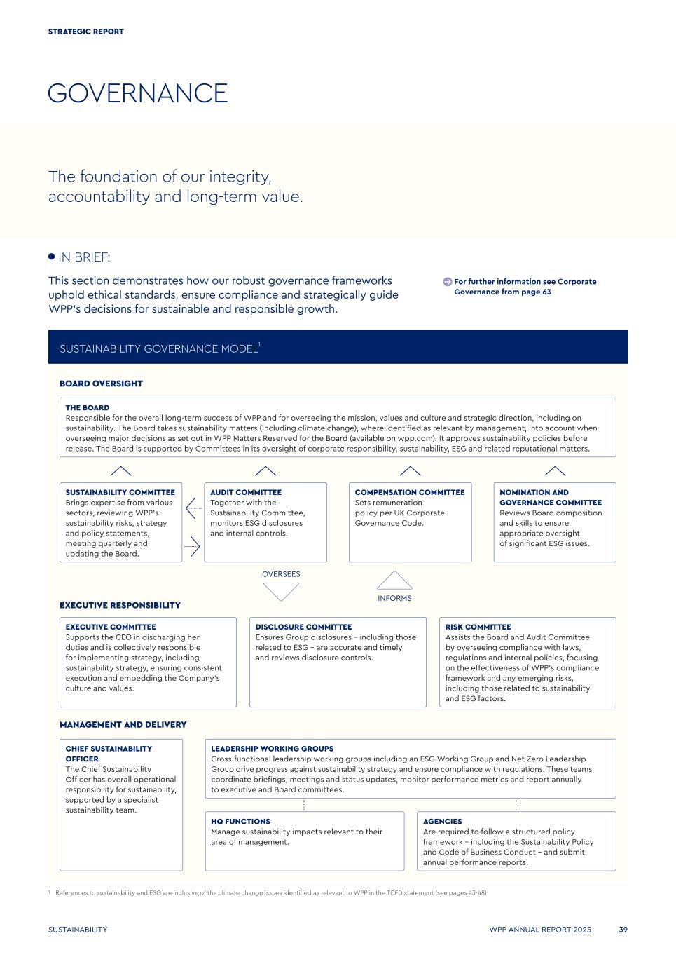 1 References to sustainability and ESG are inclusive of the climate change issues identified as relevant to WPP in the TCFD statement (see pages 43-48) SUSTAINABILITY GOVERNANCE MODEL1 BOARD OVERSIGHT EXECUTIVE RESPONSIBILITY MANAGEMENT AND DELIVERY THE BOARD Responsible for the overall long-term success of WPP and for overseeing the mission, values and culture and strategic direction, including on sustainability. The Board takes sustainability matters (including climate change), where identified as relevant by management, into account when overseeing major decisions as set out in WPP Matters Reserved for the Board (available on wpp.com). It approves sustainability policies before release. The Board is supported by Committees in its oversight of corporate responsibility, sustainability, ESG and related reputational matters. SUSTAINABILITY COMMITTEE Brings expertise from various sectors, reviewing WPP’s sustainability risks, strategy and policy statements, meeting quarterly and updating the Board. AUDIT COMMITTEE Together with the Sustainability Committee, monitors ESG disclosures and internal controls. COMPENSATION COMMITTEE Sets remuneration policy per UK Corporate Governance Code. NOMINATION AND GOVERNANCE COMMITTEE Reviews Board composition and skills to ensure appropriate oversight of significant ESG issues. EXECUTIVE COMMITTEE Supports the CEO in discharging her duties and is collectively responsible for implementing strategy, including sustainability strategy, ensuring consistent execution and embedding the Company’s culture and values. CHIEF SUSTAINABILITY OFFICER The Chief Sustainability Officer has overall operational responsibility for sustainability, supported by a specialist sustainability team. DISCLOSURE COMMITTEE Ensures Group disclosures – including those related to ESG – are accurate and timely, and reviews disclosure controls. LEADERSHIP WORKING GROUPS Cross-functional leadership working groups including an ESG Working Group and Net Zero Leadership Group drive progress against sustainability strategy and ensure compliance with regulations. These teams coordinate briefings, meetings and status updates, monitor performance metrics and report annually to executive and Board committees. RISK COMMITTEE Assists the Board and Audit Committee by overseeing compliance with laws, regulations and internal policies, focusing on the effectiveness of WPP’s compliance framework and any emerging risks, including those related to sustainability and ESG factors. HQ FUNCTIONS Manage sustainability impacts relevant to their area of management. AGENCIES Are required to follow a structured policy framework – including the Sustainability Policy and Code of Business Conduct – and submit annual performance reports. INFORMS OVERSEES GOVERNANCE The foundation of our integrity, accountability and long-term value. For further information see Corporate Governance from page 63 IN BRIEF: This section demonstrates how our robust governance frameworks uphold ethical standards, ensure compliance and strategically guide WPP’s decisions for sustainable and responsible growth. WPP ANNUAL REPORT 2025 39 STRATEGIC REPORT SUSTAINABILITY
