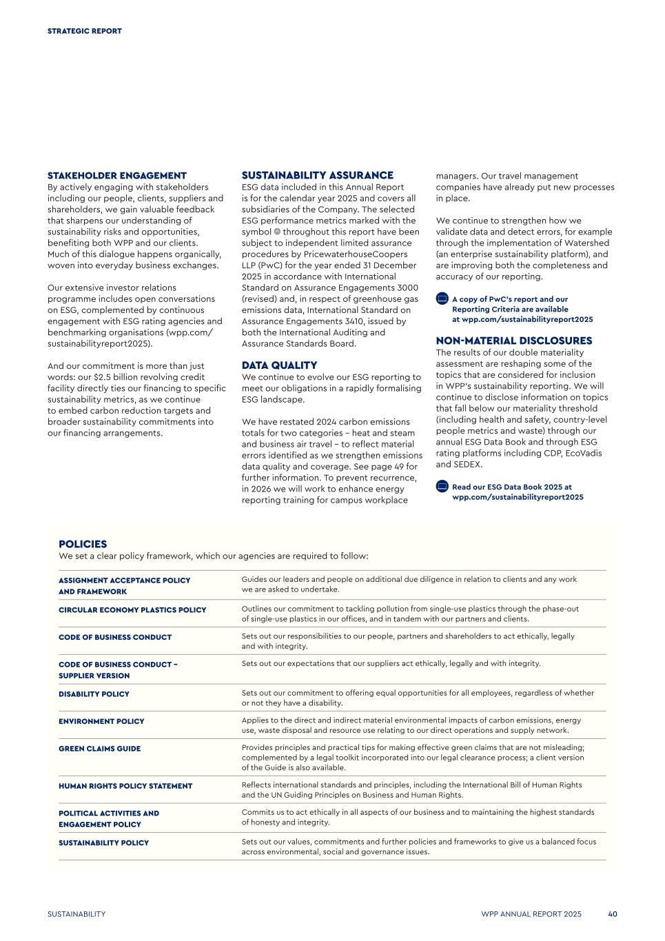 STAKEHOLDER ENGAGEMENT By actively engaging with stakeholders including our people, clients, suppliers and shareholders, we gain valuable feedback that sharpens our understanding of sustainability risks and opportunities, benefiting both WPP and our clients. Much of this dialogue happens organically, woven into everyday business exchanges. Our extensive investor relations programme includes open conversations on ESG, complemented by continuous engagement with ESG rating agencies and benchmarking organisations (wpp.com/ sustainabilityreport2025). And our commitment is more than just words: our $2.5 billion revolving credit facility directly ties our financing to specific sustainability metrics, as we continue to embed carbon reduction targets and broader sustainability commitments into our financing arrangements. SUSTAINABILITY ASSURANCE ESG data included in this Annual Report is for the calendar year 2025 and covers all subsidiaries of the Company. The selected ESG performance metrics marked with the symbol throughout this report have been subject to independent limited assurance procedures by PricewaterhouseCoopers LLP (PwC) for the year ended 31 December 2025 in accordance with International Standard on Assurance Engagements 3000 (revised) and, in respect of greenhouse gas emissions data, International Standard on Assurance Engagements 3410, issued by both the International Auditing and Assurance Standards Board. DATA QUALITY We continue to evolve our ESG reporting to meet our obligations in a rapidly formalising ESG landscape. We have restated 2024 carbon emissions totals for two categories – heat and steam and business air travel – to reflect material errors identified as we strengthen emissions data quality and coverage. See page 49 for further information. To prevent recurrence, in 2026 we will work to enhance energy reporting training for campus workplace managers. Our travel management companies have already put new processes in place. We continue to strengthen how we validate data and detect errors, for example through the implementation of Watershed (an enterprise sustainability platform), and are improving both the completeness and accuracy of our reporting.   A copy of PwC’s report and our Reporting Criteria are available at wpp.com/sustainabilityreport2025 NON-MATERIAL DISCLOSURES The results of our double materiality assessment are reshaping some of the topics that are considered for inclusion in WPP’s sustainability reporting. We will continue to disclose information on topics that fall below our materiality threshold (including health and safety, country-level people metrics and waste) through our annual ESG Data Book and through ESG rating platforms including CDP, EcoVadis and SEDEX.   Read our ESG Data Book 2025 at wpp.com/sustainabilityreport2025 POLICIES We set a clear policy framework, which our agencies are required to follow: ASSIGNMENT ACCEPTANCE POLICY AND FRAMEWORK Guides our leaders and people on additional due diligence in relation to clients and any work we are asked to undertake. CIRCULAR ECONOMY PLASTICS POLICY Outlines our commitment to tackling pollution from single-use plastics through the phase-out of single-use plastics in our offices, and in tandem with our partners and clients. CODE OF BUSINESS CONDUCT Sets out our responsibilities to our people, partners and shareholders to act ethically, legally and with integrity. CODE OF BUSINESS CONDUCT – SUPPLIER VERSION Sets out our expectations that our suppliers act ethically, legally and with integrity. DISABILITY POLICY Sets out our commitment to offering equal opportunities for all employees, regardless of whether or not they have a disability. ENVIRONMENT POLICY Applies to the direct and indirect material environmental impacts of carbon emissions, energy use, waste disposal and resource use relating to our direct operations and supply network. GREEN CLAIMS GUIDE Provides principles and practical tips for making effective green claims that are not misleading; complemented by a legal toolkit incorporated into our legal clearance process; a client version of the Guide is also available. HUMAN RIGHTS POLICY STATEMENT Reflects international standards and principles, including the International Bill of Human Rights and the UN Guiding Principles on Business and Human Rights. POLITICAL ACTIVITIES AND ENGAGEMENT POLICY Commits us to act ethically in all aspects of our business and to maintaining the highest standards of honesty and integrity. SUSTAINABILITY POLICY Sets out our values, commitments and further policies and frameworks to give us a balanced focus across environmental, social and governance issues. WPP ANNUAL REPORT 2025 40 STRATEGIC REPORT SUSTAINABILITY