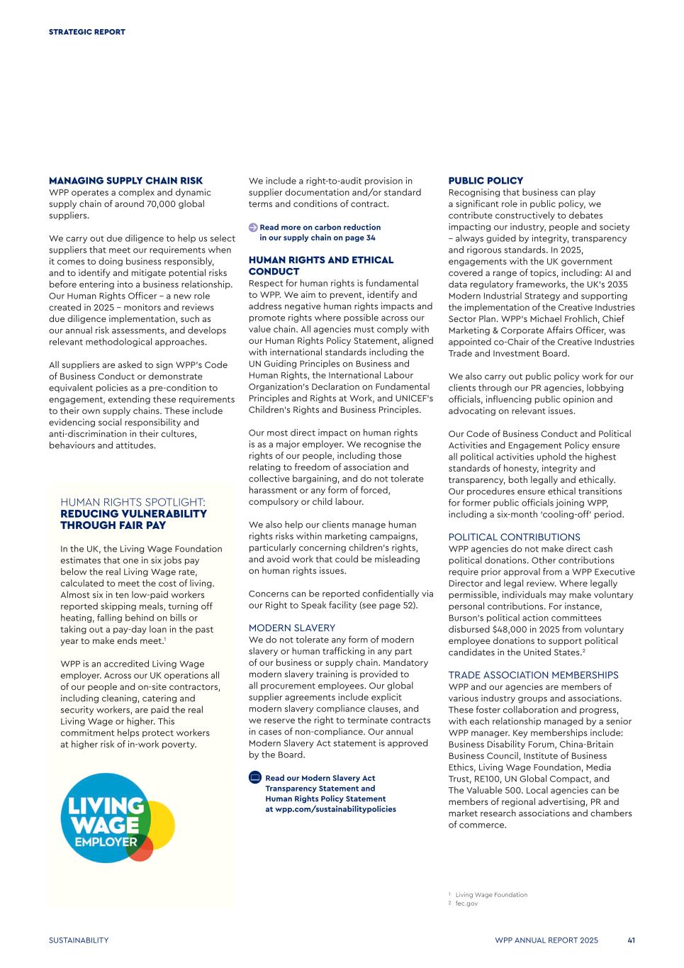 PUBLIC POLICY Recognising that business can play a significant role in public policy, we contribute constructively to debates impacting our industry, people and society – always guided by integrity, transparency and rigorous standards. In 2025, engagements with the UK government covered a range of topics, including: AI and data regulatory frameworks, the UK’s 2035 Modern Industrial Strategy and supporting the implementation of the Creative Industries Sector Plan. WPP’s Michael Frohlich, Chief Marketing & Corporate Affairs Officer, was appointed co-Chair of the Creative Industries Trade and Investment Board. We also carry out public policy work for our clients through our PR agencies, lobbying officials, influencing public opinion and advocating on relevant issues. Our Code of Business Conduct and Political Activities and Engagement Policy ensure all political activities uphold the highest standards of honesty, integrity and transparency, both legally and ethically. Our procedures ensure ethical transitions for former public officials joining WPP, including a six-month ‘cooling-off’ period. POLITICAL CONTRIBUTIONS WPP agencies do not make direct cash political donations. Other contributions require prior approval from a WPP Executive Director and legal review. Where legally permissible, individuals may make voluntary personal contributions. For instance, Burson’s political action committees disbursed $48,000 in 2025 from voluntary employee donations to support political candidates in the United States.2 TRADE ASSOCIATION MEMBERSHIPS WPP and our agencies are members of various industry groups and associations. These foster collaboration and progress, with each relationship managed by a senior WPP manager. Key memberships include: Business Disability Forum, China-Britain Business Council, Institute of Business Ethics, Living Wage Foundation, Media Trust, RE100, UN Global Compact, and The Valuable 500. Local agencies can be members of regional advertising, PR and market research associations and chambers of commerce. 1 Living Wage Foundation 2 fec.gov MANAGING SUPPLY CHAIN RISK WPP operates a complex and dynamic supply chain of around 70,000 global suppliers. We carry out due diligence to help us select suppliers that meet our requirements when it comes to doing business responsibly, and to identify and mitigate potential risks before entering into a business relationship. Our Human Rights Officer – a new role created in 2025 – monitors and reviews due diligence implementation, such as our annual risk assessments, and develops relevant methodological approaches. All suppliers are asked to sign WPP’s Code of Business Conduct or demonstrate equivalent policies as a pre-condition to engagement, extending these requirements to their own supply chains. These include evidencing social responsibility and anti-discrimination in their cultures, behaviours and attitudes. We include a right-to-audit provision in supplier documentation and/or standard terms and conditions of contract. Read more on carbon reduction in our supply chain on page 34 HUMAN RIGHTS AND ETHICAL CONDUCT Respect for human rights is fundamental to WPP. We aim to prevent, identify and address negative human rights impacts and promote rights where possible across our value chain. All agencies must comply with our Human Rights Policy Statement, aligned with international standards including the UN Guiding Principles on Business and Human Rights, the International Labour Organization’s Declaration on Fundamental Principles and Rights at Work, and UNICEF’s Children’s Rights and Business Principles. Our most direct impact on human rights is as a major employer. We recognise the rights of our people, including those relating to freedom of association and collective bargaining, and do not tolerate harassment or any form of forced, compulsory or child labour. We also help our clients manage human rights risks within marketing campaigns, particularly concerning children’s rights, and avoid work that could be misleading on human rights issues. Concerns can be reported confidentially via our Right to Speak facility (see page 52). MODERN SLAVERY We do not tolerate any form of modern slavery or human trafficking in any part of our business or supply chain. Mandatory modern slavery training is provided to all procurement employees. Our global supplier agreements include explicit modern slavery compliance clauses, and we reserve the right to terminate contracts in cases of non-compliance. Our annual Modern Slavery Act statement is approved by the Board.   Read our Modern Slavery Act Transparency Statement and Human Rights Policy Statement at wpp.com/sustainabilitypolicies HUMAN RIGHTS SPOTLIGHT: REDUCING VULNERABILITY THROUGH FAIR PAY In the UK, the Living Wage Foundation estimates that one in six jobs pay below the real Living Wage rate, calculated to meet the cost of living. Almost six in ten low-paid workers reported skipping meals, turning off heating, falling behind on bills or taking out a pay-day loan in the past year to make ends meet.1 WPP is an accredited Living Wage employer. Across our UK operations all of our people and on-site contractors, including cleaning, catering and security workers, are paid the real Living Wage or higher. This commitment helps protect workers at higher risk of in-work poverty. WPP ANNUAL REPORT 2025 41 STRATEGIC REPORT SUSTAINABILITY