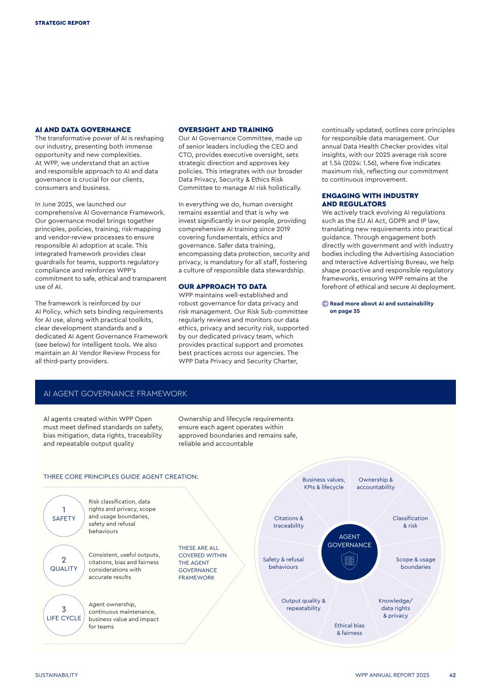 OVERSIGHT AND TRAINING Our AI Governance Committee, made up of senior leaders including the CEO and CTO, provides executive oversight, sets strategic direction and approves key policies. This integrates with our broader Data Privacy, Security & Ethics Risk Committee to manage AI risk holistically. In everything we do, human oversight remains essential and that is why we invest significantly in our people, providing comprehensive AI training since 2019 covering fundamentals, ethics and governance. Safer data training, encompassing data protection, security and privacy, is mandatory for all staff, fostering a culture of responsible data stewardship. OUR APPROACH TO DATA WPP maintains well-established and robust governance for data privacy and risk management. Our Risk Sub-committee regularly reviews and monitors our data ethics, privacy and security risk, supported by our dedicated privacy team, which provides practical support and promotes best practices across our agencies. The WPP Data Privacy and Security Charter, continually updated, outlines core principles for responsible data management. Our annual Data Health Checker provides vital insights, with our 2025 average risk score at 1.54 (2024: 1.56), where five indicates maximum risk, reflecting our commitment to continuous improvement. ENGAGING WITH INDUSTRY AND REGULATORS We actively track evolving AI regulations such as the EU AI Act, GDPR and IP law, translating new requirements into practical guidance. Through engagement both directly with government and with industry bodies including the Advertising Association and Interactive Advertising Bureau, we help shape proactive and responsible regulatory frameworks, ensuring WPP remains at the forefront of ethical and secure AI deployment. Read more about AI and sustainability on page 35 AI AND DATA GOVERNANCE The transformative power of AI is reshaping our industry, presenting both immense opportunity and new complexities. At WPP, we understand that an active and responsible approach to AI and data governance is crucial for our clients, consumers and business. In June 2025, we launched our comprehensive AI Governance Framework. Our governance model brings together principles, policies, training, risk‑mapping and vendor‑review processes to ensure responsible AI adoption at scale. This integrated framework provides clear guardrails for teams, supports regulatory compliance and reinforces WPP’s commitment to safe, ethical and transparent use of AI. The framework is reinforced by our AI Policy, which sets binding requirements for AI use, along with practical toolkits, clear development standards and a dedicated AI Agent Governance Framework (see below) for intelligent tools. We also maintain an AI Vendor Review Process for all third-party providers. AI AGENT GOVERNANCE FRAMEWORK Al agents created within WPP Open must meet defined standards on safety, bias mitigation, data rights, traceability and repeatable output quality THREE CORE PRINCIPLES GUIDE AGENT CREATION: 2 QUALITY 3 LIFE CYCLE Risk classification, data rights and privacy, scope and usage boundaries, safety and refusal behaviours Consistent, useful outputs, citations, bias and fairness considerations with accurate results Agent ownership, continuous maintenance, business value and impact for teams 1 SAFETY THESE ARE ALL COVERED WITHIN THE AGENT GOVERNANCE FRAMEWORK Ownership and lifecycle requirements ensure each agent operates within approved boundaries and remains safe, reliable and accountable Ownership & accountability Classification & risk Scope & usage boundaries Knowledge/ data rights & privacy Ethical bias & fairness Output quality & repeatability Safety & refusal behaviours Citations & traceability Business values, KPIs & lifecycle AGENT GOVERNANCE WPP ANNUAL REPORT 2025 42 STRATEGIC REPORT SUSTAINABILITY