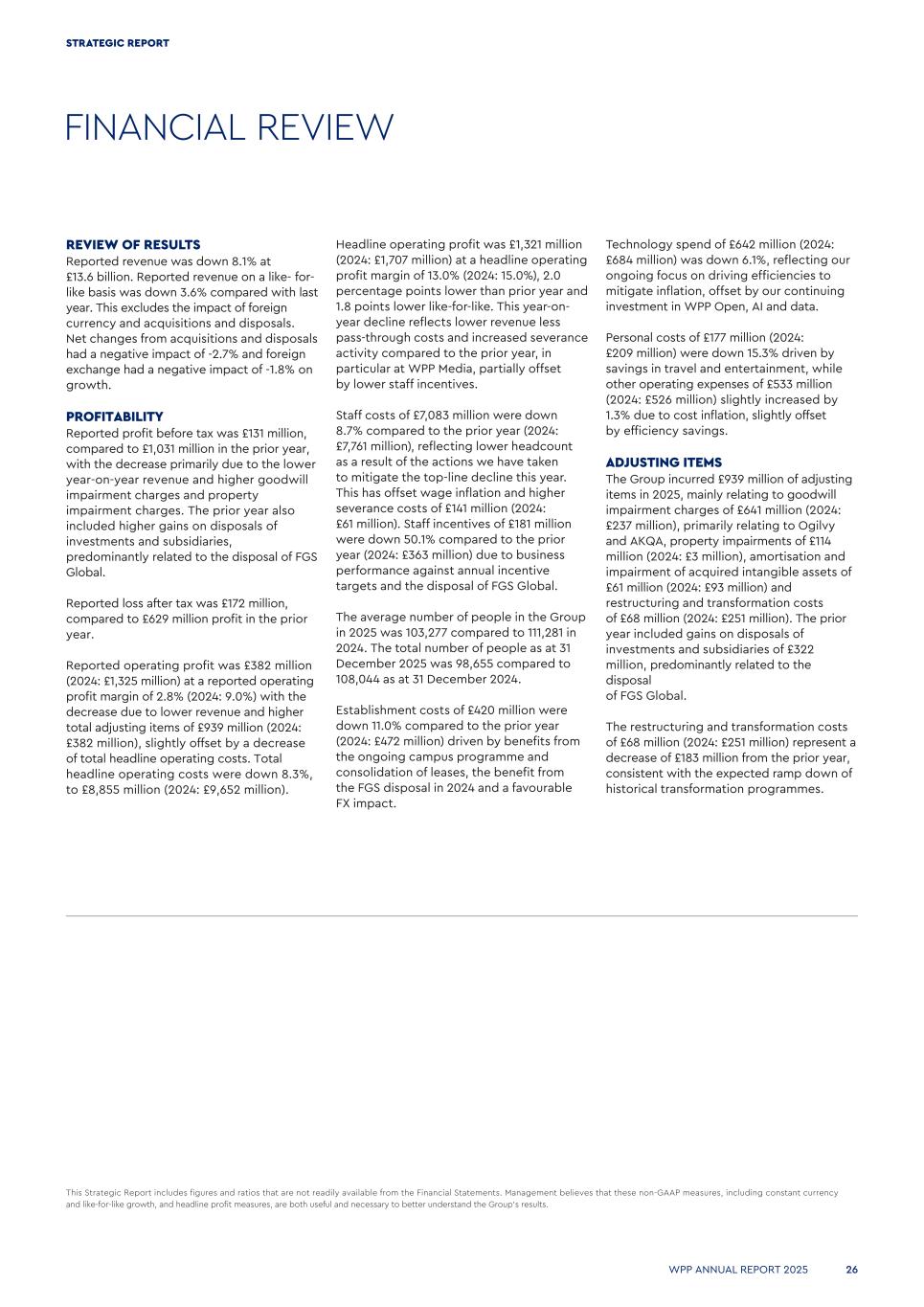 FINANCIAL REVIEW REVIEW OF RESULTS Reported revenue was down 8.1% at £13.6 billion. Reported revenue on a like- for- like basis was down 3.6% compared with last year. This excludes the impact of foreign currency and acquisitions and disposals. Net changes from acquisitions and disposals had a negative impact of -2.7% and foreign exchange had a negative impact of -1.8% on growth. PROFITABILITY Reported profit before tax was £131 million, compared to £1,031 million in the prior year, with the decrease primarily due to the lower year-on-year revenue and higher goodwill impairment charges and property impairment charges. The prior year also included higher gains on disposals of investments and subsidiaries, predominantly related to the disposal of FGS Global. Reported loss after tax was £172 million, compared to £629 million profit in the prior year. Reported operating profit was £382 million (2024: £1,325 million) at a reported operating profit margin of 2.8% (2024: 9.0%) with the decrease due to lower revenue and higher total adjusting items of £939 million (2024: £382 million), slightly offset by a decrease of total headline operating costs. Total headline operating costs were down 8.3%, to £8,855 million (2024: £9,652 million). Headline operating profit was £1,321 million (2024: £1,707 million) at a headline operating profit margin of 13.0% (2024: 15.0%), 2.0 percentage points lower than prior year and 1.8 points lower like-for-like. This year-on- year decline reflects lower revenue less pass-through costs and increased severance activity compared to the prior year, in particular at WPP Media, partially offset by lower staff incentives. Staff costs of £7,083 million were down 8.7% compared to the prior year (2024: £7,761 million), reflecting lower headcount as a result of the actions we have taken to mitigate the top-line decline this year. This has offset wage inflation and higher severance costs of £141 million (2024: £61 million). Staff incentives of £181 million were down 50.1% compared to the prior year (2024: £363 million) due to business performance against annual incentive targets and the disposal of FGS Global. The average number of people in the Group in 2025 was 103,277 compared to 111,281 in 2024. The total number of people as at 31 December 2025 was 98,655 compared to 108,044 as at 31 December 2024. Establishment costs of £420 million were down 11.0% compared to the prior year (2024: £472 million) driven by benefits from the ongoing campus programme and consolidation of leases, the benefit from the FGS disposal in 2024 and a favourable FX impact. Technology spend of £642 million (2024: £684 million) was down 6.1%, reflecting our ongoing focus on driving efficiencies to mitigate inflation, offset by our continuing investment in WPP Open, AI and data. Personal costs of £177 million (2024: £209 million) were down 15.3% driven by savings in travel and entertainment, while other operating expenses of £533 million (2024: £526 million) slightly increased by 1.3% due to cost inflation, slightly offset by efficiency savings. ADJUSTING ITEMS The Group incurred £939 million of adjusting items in 2025, mainly relating to goodwill impairment charges of £641 million (2024: £237 million), primarily relating to Ogilvy and AKQA, property impairments of £114 million (2024: £3 million), amortisation and impairment of acquired intangible assets of £61 million (2024: £93 million) and restructuring and transformation costs of £68 million (2024: £251 million). The prior year included gains on disposals of investments and subsidiaries of £322 million, predominantly related to the disposal of FGS Global. The restructuring and transformation costs of £68 million (2024: £251 million) represent a decrease of £183 million from the prior year, consistent with the expected ramp down of historical transformation programmes. This Strategic Report includes figures and ratios that are not readily available from the Financial Statements. Management believes that these non-GAAP measures, including constant currency and like-for-like growth, and headline profit measures, are both useful and necessary to better understand the Group’s results. WPP ANNUAL REPORT 2025 26 STRATEGIC REPORT